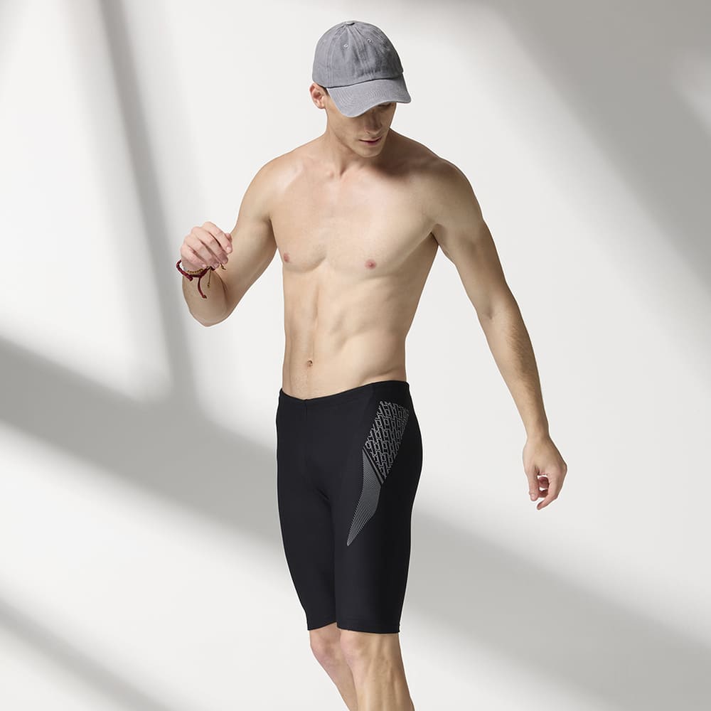 莫妮娜 台灣製 大男 玩水必備 七分泳褲 格子線段黑色 -3L