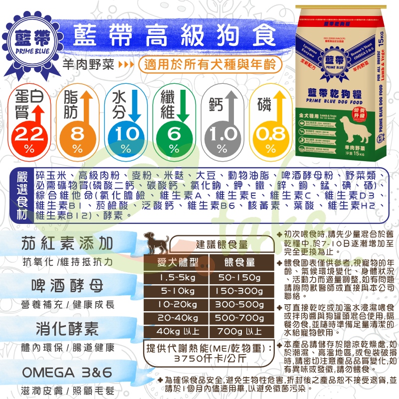 【藍帶高級】成犬 15kg 羊肉蔬果【商品規格】15kg製造地:台灣鑑賞期並非試用期,本商品一經拆封使用,恕無法辦理退貨,退貨的商品必須為全新狀態且完正包裝,敬請見諒,商品請以實體為主 。