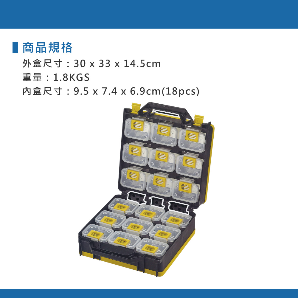 品 名:多功能18格零件盒(強化型)重 量:1.8kgs外盒尺寸:30x14.5x33cm內盒尺寸:9.5x7.4x6.9cm內 附:小收納盒 18個、自黏標籤、背帶1條