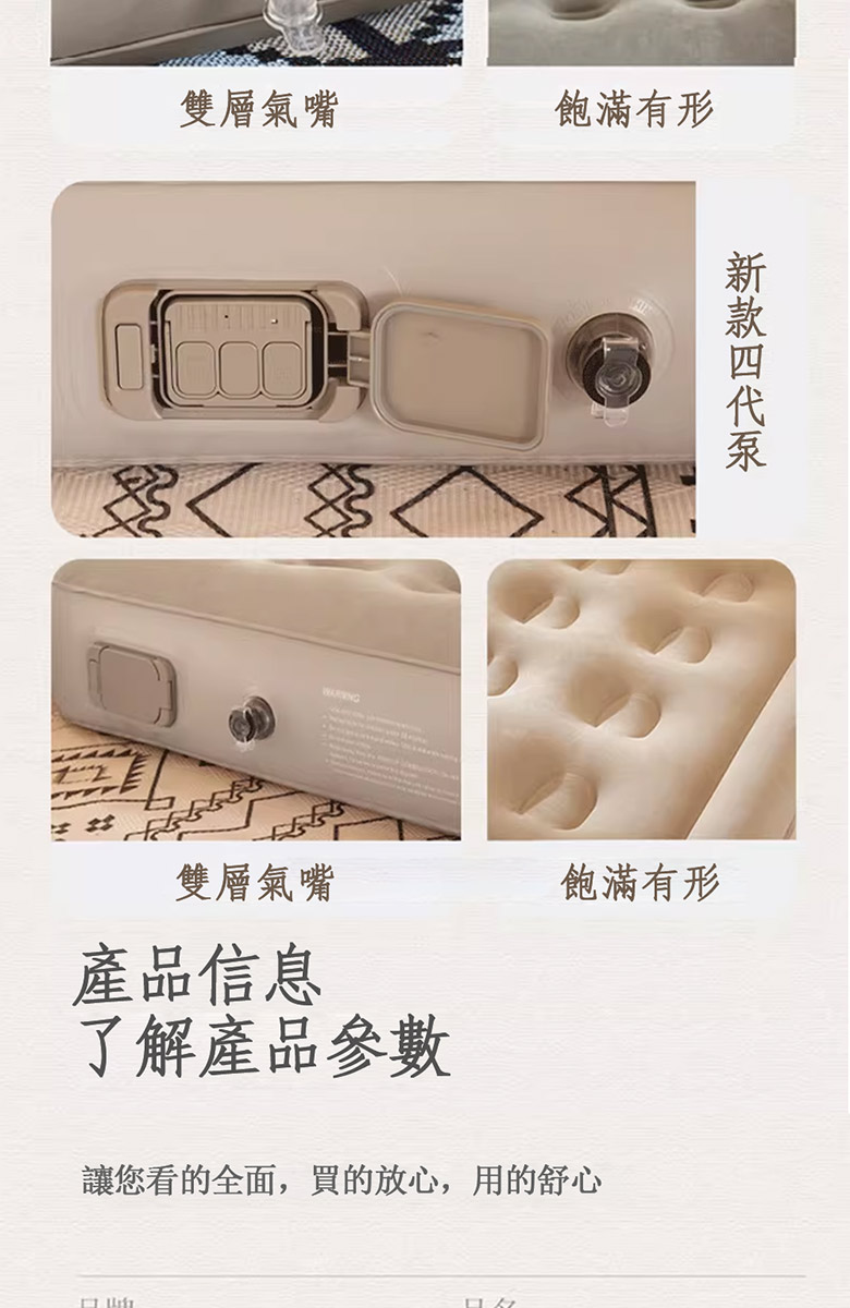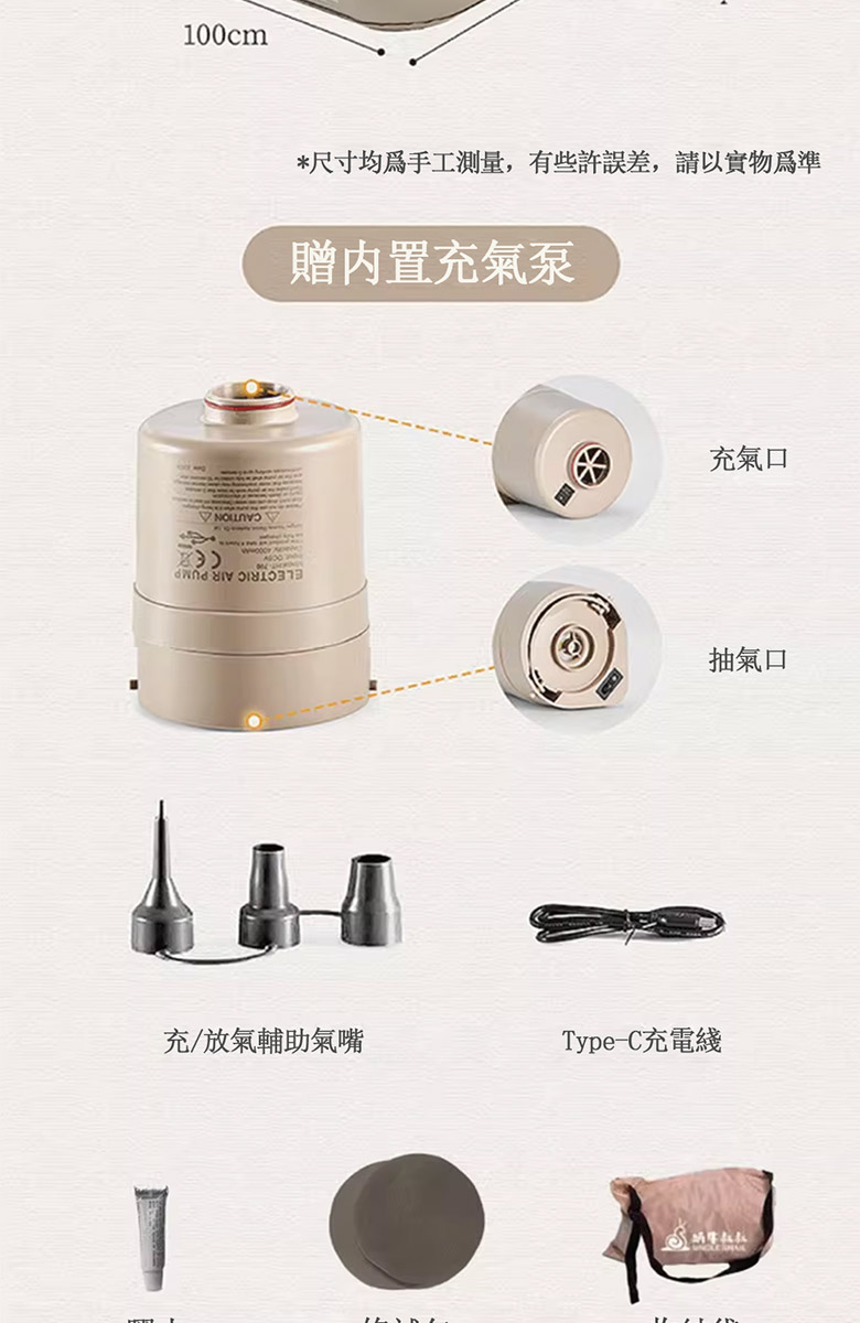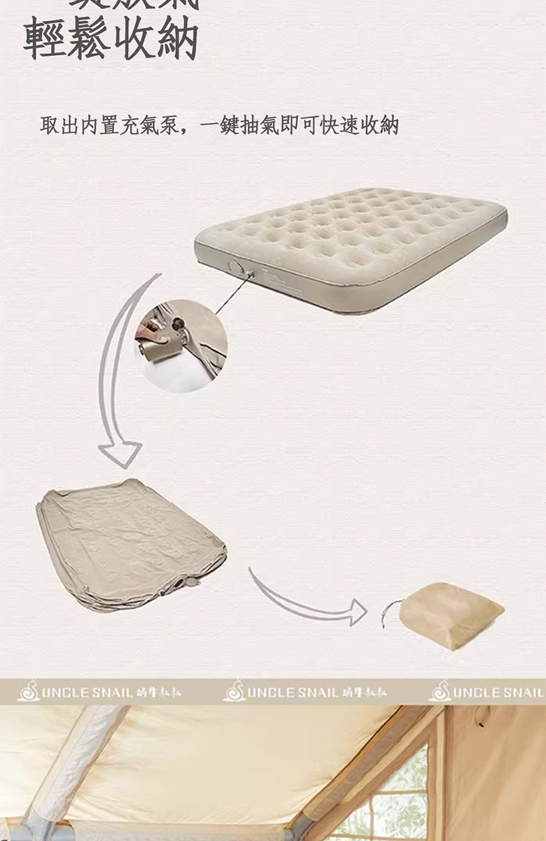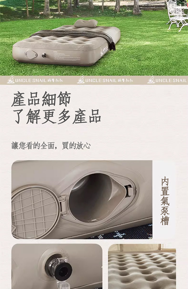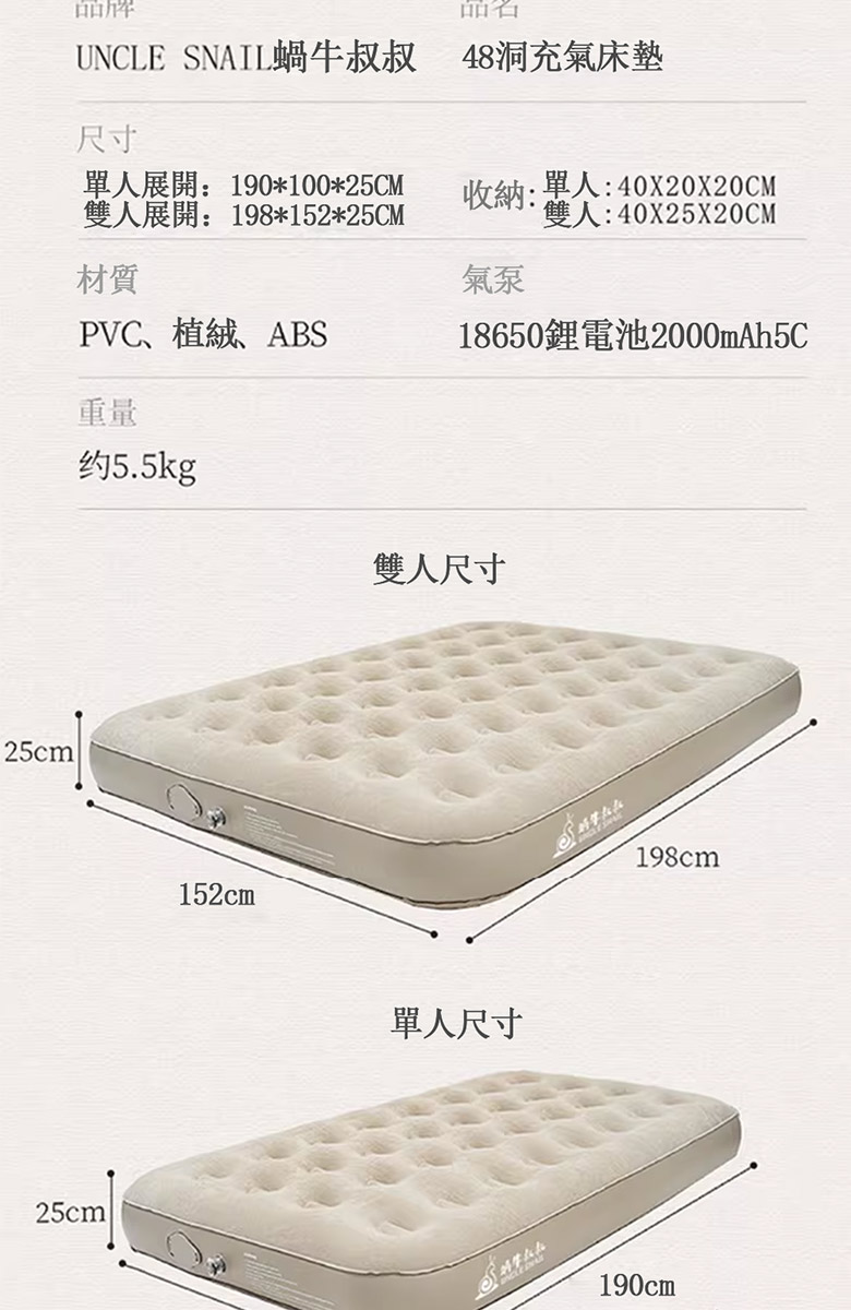 🛌【内置充氣泵創新設計|蝸牛叔叔 48 洞自動充氣床墊】戶外露營與臨時臥眠的首選,以極致舒適與便利體驗,重新定義移動式睡眠!🏆✨ 為什麼數萬戶外玩家都選這張床?2 分鐘極速充放氣:新一代四合一充氣泵,充氣、排氣一鍵完成,從收納到就寢無需等待。靜音睡眠科技:充氣運轉聲量低至 25dB,夜晚充氣不打擾室友與露營同伴。300KG 超強承重:蜂巢式氣柱結構,雙人使用也穩固不塌陷,長期使用不易變形。親膚植絨面料:頂級植絨表面透氣吸濕,觸感溫柔如雲朵,搭配 25cm 加厚設計,釋壓減震效果媲美彈簧床墊。🛠 黑科技細節滿滿內置可拆式充氣泵:不僅專為床墊設計,搭配附贈轉接頭還能為充氣枕、充氣沙發等其他設備充氣,一物多用。雙層氣嘴防漏:專利氣閥結構,充飽氣後長時間不漏氣,露營幾天也能維持最佳彈性。輕鬆收納體積小:放氣後體積縮小 90%,收納袋體積僅有登機箱的 1/3,後車廂、露營帳篷輕鬆收納。IPX4 防潑水:PVC 底層具備防潑水功能,草地、露營地等潮濕環境也能安心使用。🎯 誰適合這張床?✅ 露營愛好者:追求舒適睡眠體驗,不想妥協於傳統露營墊的硬質感✅ 租房族 / 學生:需要臨時床墊,來客時快速變身客房✅ 車露玩家:後車廂空間有限,充氣床墊提供雙人舒適臥鋪✅ 備用床需求:親友過夜時,隨時提供五星級臨時床鋪🛌產品規格一次看懂品牌:UNCLE SNAIL 蝸牛叔叔品名:48洞充氣床墊(内置泵四代款)單人尺寸:190×100×25cm(收納:40×20×20cm)雙人尺寸:198×152×25cm(收納:40×25×20cm)材質:PVC + 親膚植絨 + ABS 氣泵充氣時間:約2分鐘承重:300KG產地:PRC(中國台灣監製)🎁 加碼贈品購買即贈:奶酪枕 ×1 + 修補包 ×1 + 收納袋 ×1讓你從頭到腳都能享受頂級睡眠體驗!