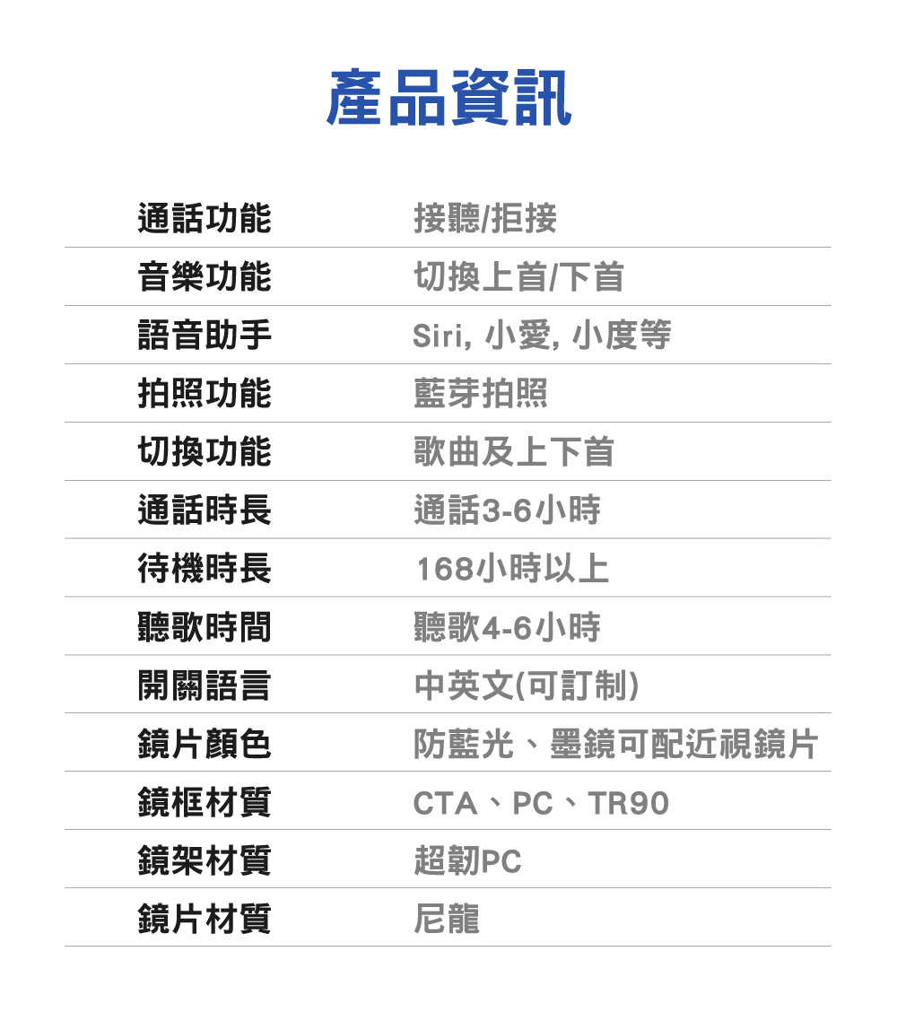 【產品規格】型號:CME-BT1100控制方式:左右觸控操作藍牙版本:Bluetooth 5.0(連線距離約12公尺)電池容量:80mAh x2充電方式:雙邊磁吸式2針接頭充電時間:約4小時待機時間:約168小時防水等級:IP65重量:約154g彩盒尺寸:170 x 60 x 56mm配件內容:智慧眼鏡x1、眼鏡盒x1、眼鏡布x1、USB充電線x1、快速使用指南x1BSMI:R34985NCC:CCAP24LP5030T0本產品翻譯功能是提供翻譯卡片, 使用期限是一年,以barcode 條碼開啟使用日期起計算, 滿一年後需重新購買翻譯卡片, 費用$100/年