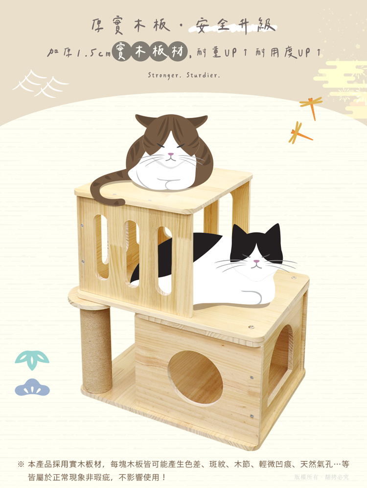 秉持匠人精神,每個跳台皆由台灣【貓本屋】獨家打造,從選材、裁切、打磨、裝箱,每個細節都蘊含對毛孩的關愛與用心。 多層結構設計,提供貓咪充分的攀爬、跳躍與休息空間,符合貓咪天性。加大小木屋,可依貓咪喜好放入抓板、絨毛墊、涼墊,是最佳的隱私空間。 採用1.5mm加厚實木板材,搭配8.8cm加粗麻繩柱,抗晃耐抓穩如泰山,板材通過TAF無甲醛認證,守護毛孩每一刻跳躍與休憩。邊角皆經純手工打磨,溫潤無銳角,讓毛孩從爬到睡都更安全。 注意事項:.本產品採用實木板材,每塊木板皆可能產生色差、斑紋、木節、輕微凹痕、 天然氣孔…等,皆屬於正常現象非瑕疵,不影響使用!.實木產品在熱脹冷縮的作用下,板材均會有變形率,屬正常現象。.本商品為接觸型商品,為避免傳染性疾病(如:跳蚤/壁蝨/疥癬…等) 一經開封或試用過,恕不受理更換事宜。.商品須自行組裝,購買前請仔細確認款式、規格是否符合需求,謹慎購買, 恕不接受個人因素退貨。如收到商品有瑕疵或缺少配件,請於鑑賞期內反應, 我司將儘快協助您。.本產品僅用於寵物使用,切勿用於其他用途。.商品圖檔顏色因電腦螢幕設定差異會略有不同,以實際商品顏色為準。.尺寸與重量皆採手工測量,±5%誤差屬正常範圍。 轉載敬告:鈞嵐(立嵐)之商品圖文、影片或商標等,皆屬鈞嵐(立嵐)版權所有,若未經同意即任意轉載刊登者,我司將進行相關智慧財產著作權與商標權及商業法的追訴權利。 產品規格: .商品型號:OO-P-TS5804.商品名稱:貓本屋 雙層疊疊樂 實木大貓窩 階梯貓跳台.尺 寸:約 58 x 46 x 66 cm (底板x高).重 量:約 11 kg (±5%).適用範圍.全齡貓.材 質:松木實木、金屬、麻繩.商品保固:僅限新品瑕疵可更換商品.產 地:台灣