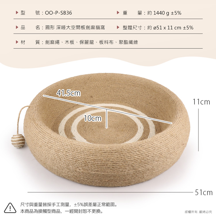 - 品 名:貓本屋 圓形 劍麻深睡大空間貓抓板貓窩