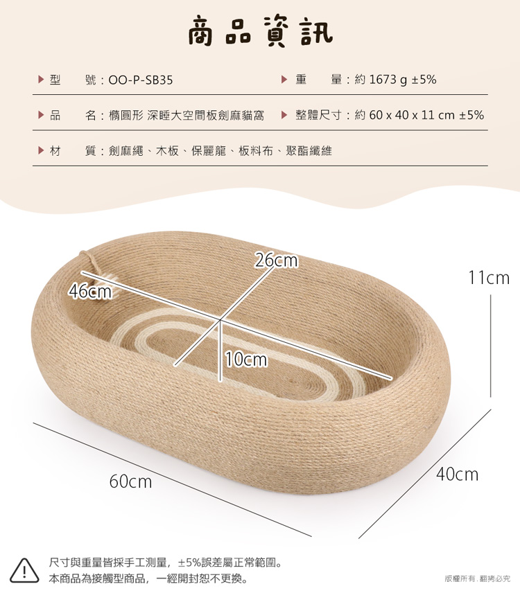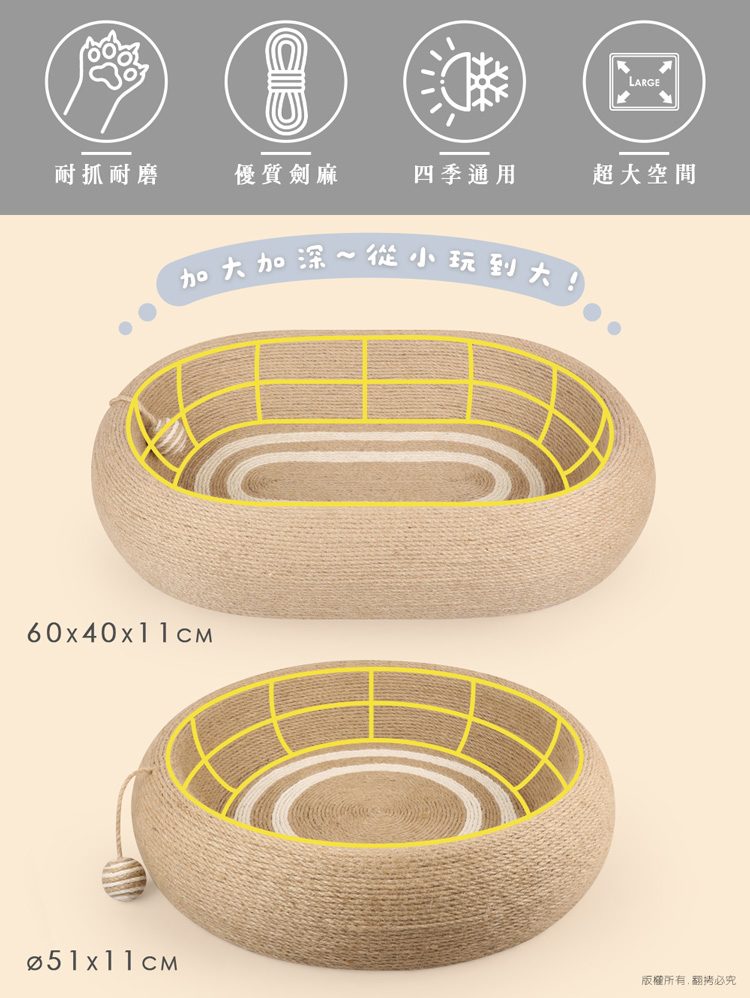 - 品 名:貓本屋 橢圓形 劍麻深睡大空間貓抓板貓窩