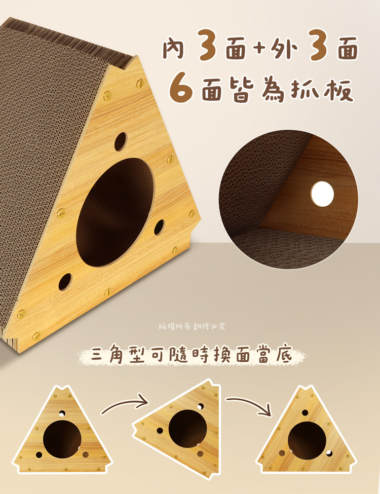貓本屋 三角形立式貓抓板貓窩 ★內外皆為貓抓板★ --高密度瓦楞紙+密集板,三角型可任意翻面-- 高密度瓦楞紙板+密集板,可爬可抓玩累了還可躺進屋內,玩樂與休息合而為一! 裏3面+外3面,6面皆為貓抓板,隨時磨爪,穩固不怕壓,讓大貓小貓都可玩翻天!注意事項: .本商品為接觸型商品,為避免傳染性疾病(如:跳蚤/壁蝨/疥癬…等) 一經開封或試用過,恕不受理更換事宜。.購買前仔細詳閱商品規格尺寸,慎重購買,以免造成日後買賣糾紛。.此商品屬瓦楞紙製品,在製作上由於裁剪工藝的原因,難免會有些許 切割裁剪留下的痕跡,屬正常情況非瑕疵!.本產品僅供寵物使用,禁止兒童攀爬,以免造成危險。.所有的規格與重量皆採手工測量,誤差±3%屬正常範圍。 轉載敬告: 鈞嵐(立嵐)之商品圖文、影片或商標等,皆屬鈞嵐(立嵐)版權所有, 若未經同意即任意轉載刊登者,我司將進行相關智慧財產著作權與 商標權及商業法的追訴權利。 商品規格: .型 號:OO-P-SB33.品 名:貓本屋 三角形立式貓抓板貓窩.款 式:木紋.尺 寸:約 28 x 40.5 x 40 cm ±3%.重 量:約 1430 g ±3%.材 質:密集板+瓦楞紙.包裝內含:密集板 x2、貓抓板 x3、螺絲起子 x1、 塑膠螺絲 x18.商品保固:僅限新品瑕疵更可換商品.產 地:中國大陸