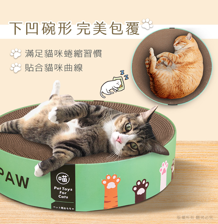 貓本屋 下凹式圓形貓抓板貓窩(41x41x10cm)★貓床/貓抓板/磨爪★ --休息貓窩結合磨爪抓板,一物多用途----環保高密度瓦楞紙板製造,善待地球-- 高密度瓦楞紙板製造,環保可回收,不需組裝取出即用將『休息貓窩』與『玩樂磨爪貓抓板』完美結合!立刻讓貓咪擁有一個可玩樂/磨爪/休息的地方! 採用下凹式工藝,完全貼合貓咪身形,讓貓咪舒適蜷縮底部全包覆封閉式設計,抓板屑不會掉滿地!