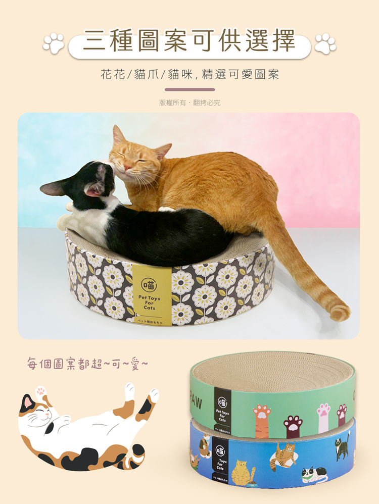 注意事項: .本商品為接觸型商品,為避免傳染性疾病(如:跳蚤/壁蝨/疥癬…等) 一經開封或試用過,恕不受理更換事宜。.購買前仔細詳閱商品規格尺寸,慎重購買,以免造成日後買賣糾紛。.此商品屬紙製品,在製作上由於裁剪工藝的原因,難免會有些許切割 裁剪留下的痕跡,屬正常情況非瑕疵!.所有的規格與重量皆採手工測量,誤差±5%屬正常範圍。 轉載警示: 鈞嵐(立嵐)之商品圖文、影片或商標等,皆屬鈞嵐(立嵐)版權所有, 若未經同意即任意轉載刊登者,我司將進行相關智慧財產著作權與 商標權及商業法的追訴權利。 商品規格: .型 號:OO-P-SB34.品 名:貓本屋 下凹式圓形貓抓板貓窩(41x41x10cm).款 式:花花/貓爪/貓咪.尺 寸:約 Ø 41 x 10 cm ±5% (直徑x高).重 量:約 810 g ±5%.材 質:瓦楞紙.包裝內含:貓抓板下凹式貓窩 x1.商品保固:僅限新品瑕疵更可換商品.產 地:中國大陸