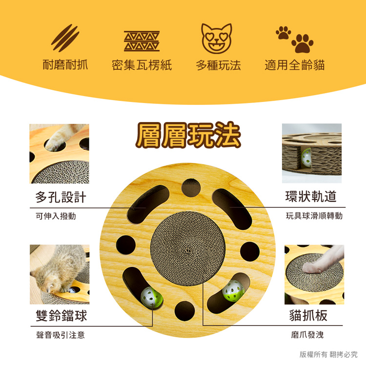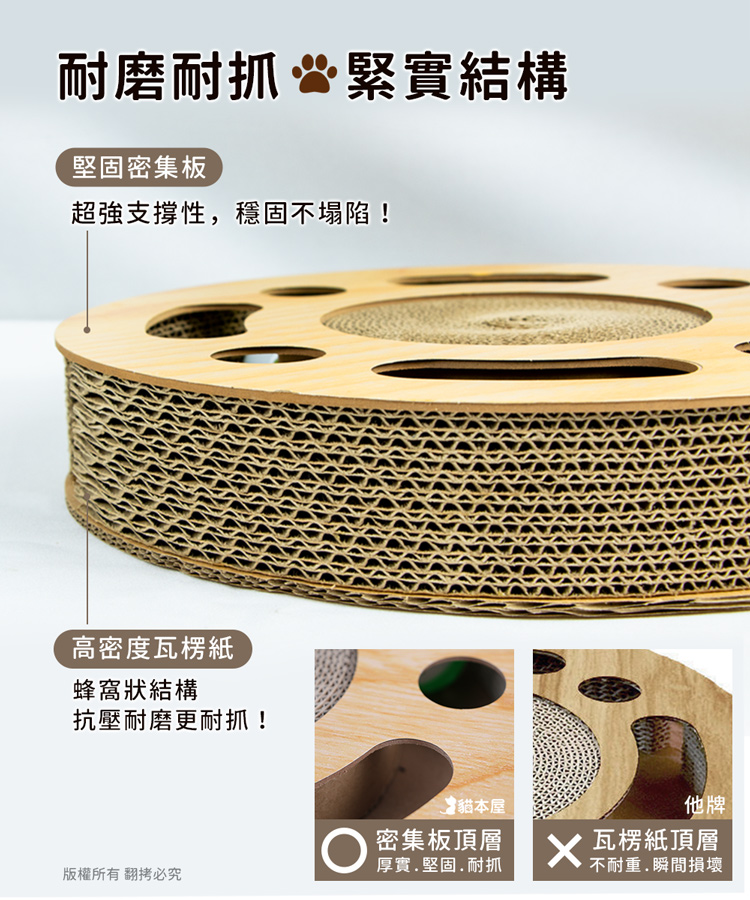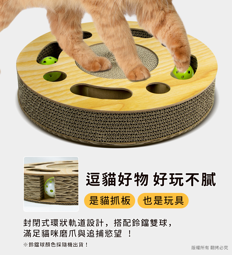 貓本屋 圓盤軌道球 貓玩具/貓抓板(Ø33cm) --多種玩法,適於全齡貓,結實高壓黏合,好玩不易變型-- 面對高冷主子卻無從下手?只有抓板或逗貓棒是行不通的,快來試試圓盤軌道球貓玩具抓板吧! 上層堅固密集板,支撐性強不易塌陷,同時搭配高密度瓦楞紙結實高壓黏合,內部再放入小鈴鐺球,在中間環軌道滾動,引起貓主子的好奇心伸入抓玩,趣味性十足! ※鈴鐺球顏色採隨機出貨!※本產品僅用於寵物使用,切勿用於其他用途。※本商品為接觸型商品,為避免傳染性疾病(如:跳蚤/壁虱/疥癬…等) 一經開封或試用過,恕不受理更換事宜。 注意事項: .本商品為接觸型商品,為避免傳染性疾病(如:跳蚤/壁虱/疥癬…等) 一經開封或試用過,恕不受理更換事宜。.購買前仔細詳閱商品規格尺寸,慎重購買,以免造成日後買賣糾紛。.本產品僅用於寵物使用,切勿用於其他用途。.商品圖檔顏色因電腦螢幕設定差異會略有不同,以實際商品顏色為準。.所有的尺寸與重量皆採手工測量,誤差±3%屬正常範圍。 轉載警示: 自民國108年6月1日起(含追溯既往),鈞嵐(立嵐)企業有限公司之 商品圖片、影片或鈞嵐(立嵐)企業有限公司文字及LOGO, 任何客戶或用戶需轉載刊登任何圖片、文字、影片 皆需經過鈞嵐(立嵐)書面同意,如有需求請與鈞嵐(立嵐)客服中心接洽聯絡。 若任何未經鈞嵐(立嵐)同意即任意轉載刊登者, 我司將進行相關智慧財產著作權與商標權及商業法的追訴權利。 產品規格: .商品型號:OO-P-SB07.商品名稱:貓本屋 圓盤軌道球 貓玩具/貓抓板.尺 寸:約 Ø 33 x 6 cm (±3%/最大外徑).重 量:約 450 g (±3%/含鈴鐺球).適用範圍:全齡貓.材 質:密集板、瓦楞紙、.包裝內含:圓盤貓抓板 x1、鈴鐺球(隨機色) x2、貓草(小包) x1.商品保固:僅限新品瑕疪可更換商品.產 地:中國大陸