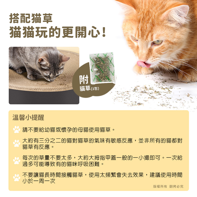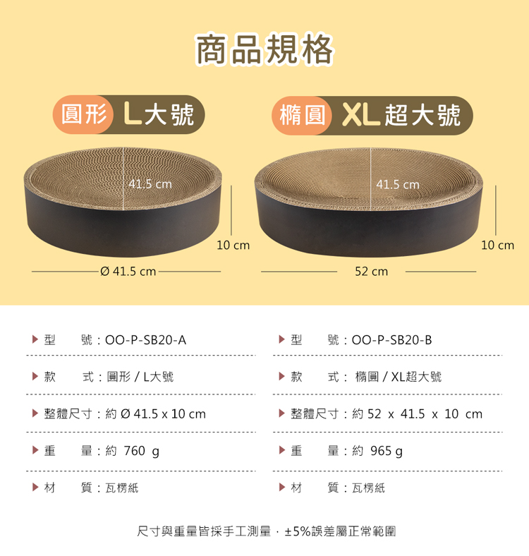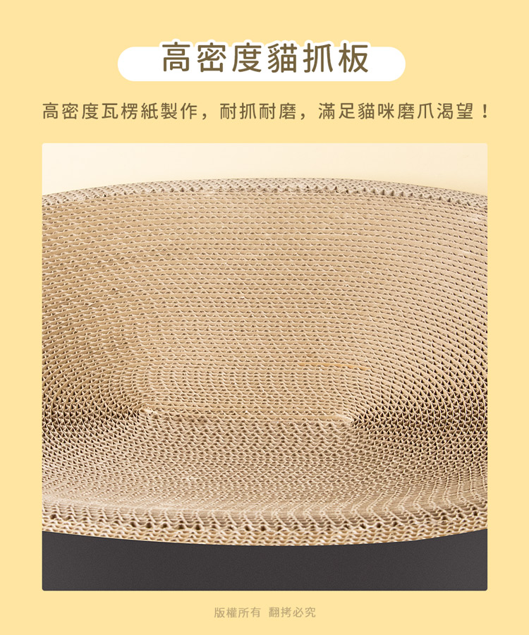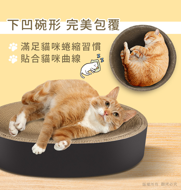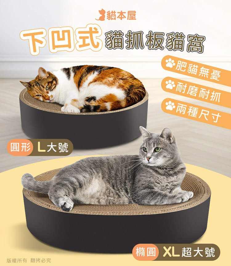 貓本屋 貓抓板下凹式貓窩★貓窩/貓床/貓抓板/磨爪★ --休息貓窩結合磨爪抓板,一物多用途----環保高密度瓦楞紙板製造,善待地球-- 高密度瓦楞紙板製造,環保可回收,不需組裝取出即用將『休息貓窩』與『玩樂磨爪貓抓板』完美結合!立刻讓貓咪擁有一個可玩樂/磨爪/休息的地方! 採用下凹式工藝,完全貼合貓咪身形,讓貓咪舒適蜷縮底部全包覆封閉式設計,抓板屑不會掉滿地! 注意事項: .本商品為接觸型商品,為避免傳染性疾病(如:跳蚤/壁虱/疥癬…等) 一經開封或試用過,恕不受理更換事宜。.購買前仔細詳閱商品規格尺寸,慎重購買,以免造成日後買賣糾紛。.此商品屬紙製品,在製作上由於裁剪工藝的原因,難免會有些許切割 裁剪留下的痕跡,屬正常情況非瑕疪!.所有的規格與重量皆採手工測量,誤差±5%屬正常範圍。 轉載警示: 自民國108年6月1日起(含追溯既往),鈞嵐(立嵐)企業有限公司之 商品圖片、影片或鈞嵐(立嵐)企業有限公司文字及LOGO, 任何客戶或用戶需轉載刊登任何圖片、文字、影片 皆需經過鈞嵐(立嵐)書面同意,如有需求請與鈞嵐(立嵐)客服中心接洽聯絡。 若任何未經鈞嵐(立嵐)同意即任意轉載刊登者, 我司將進行相關智慧財產著作權與商標權及商業法的追訴權利。 商品規格: .型 號:OO-P-SB20.品 名:貓本屋 下凹式貓抓板貓窩.款 式:圓形L大號 / 橢圓XL超大號.尺寸/重量:圓形 Ø41.5 x 10 cm / 約 760 g 橢圓 52 x 41.5 x 10 cm / 約 965 g ※尺寸與重量皆採手工測量,誤差±5%屬正常範圍!.材 質:瓦楞紙.包裝內含:貓抓板下凹式貓窩 x1、貓草(小包) x1.商品保固:僅限新品瑕疪更可換商品.產 地:中國大陸