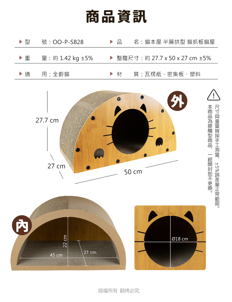 鈞嵐(立嵐)之商品圖文、影片或商標等,皆屬鈞嵐(立嵐)版權所有, 若未經同意即任意轉載刊登者,我司將進行相關智慧財產著作權與 商標權及商業法的追訴權利。 商品規格: .型 號:OO-P-SB28.品 名:貓本屋 半圓拱型 貓抓板貓屋.整體尺寸:約 27.7 x 50 x 27 cm (±5%).重 量:約 1.42 kg (±5%).材 質:瓦楞紙、密集板、塑料.適 用:全齡貓.包裝內含:前板 x1、後板 x1、平型抓板 x1、弧型抓板 x2、 螺絲起子 x1、塑膠螺絲 x20.商品保固:僅限新品瑕疵更可換商品.產 地:中國大陸