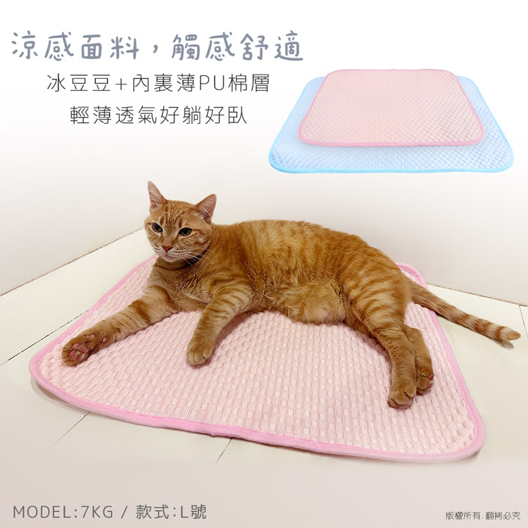 貓本屋 冰豆豆涼感寵物墊(XL號/80x60cm)★貓狗適用★ --溫和且迅速降溫,涼爽舒適,告別黏膩!-- 炎炎夏日,擔心冷氣費貴、更怕獨自留在家中的毛孩們太熱!尤其毛小孩的體溫又比人略高,除了通風的環境、提供充足的水份之外還能提供什麼避暑良方呢? 【冰豆豆涼感寵物墊】,採用冰豆豆涼感冰絲面料,皮膚接觸這種面料,會感到冰涼滑順,夏天不再擔心毛小孩太熱,不用吹冷氣也可以涼涼的!絕對是今年夏天的不二選擇! 可直接放置於寵物窩、籠子、地板、沙發上…等,趕快使用降溫墊,讓毛小孩擁有一個涼爽的休憩環境吧! ※請避免使用尖銳物割刺、或是寵物啃咬,以免造成破損。※若沾染髒污時,請立即使用濕布擦拭,避免長時間滲透!※若於溫度35℃以上的環境使用,可搭配電扇或空調,可提高使用效果。注意事項: .本商品為接觸型商品,為避免傳染性疾病(如:跳蚤/壁虱/疥癬…等) 一經開封或試用過,恕不受理更換事宜。.本產品僅供寵物使用,請勿做其他用途。.若於溫度35℃以上的環境使用,可搭配電扇或空調,可提高使用效果。.收納存放時,請放置於陰涼乾燥處,請避免靠近火源/高溫/陽光直射。.欲清理時,可直接水洗,並搭配中性潔劑,清洗完畢時直接陰乾。.請避免使用尖銳物割刺、或是寵物啃咬,以免造成布面破損。.商品圖檔顏色因電腦螢幕設定差異會略有不同,以實際商品顏色為準。.購買前仔細詳閱商品規格尺寸,慎重購買,以免造成日後買賣糾紛。.所有的規格與重量皆採手工測量,誤差±5%屬正常範圍。 轉載敬告: 鈞嵐(立嵐)之商品圖文、影片或商標等,皆屬鈞嵐(立嵐)版權所有, 若未經同意即任意轉載刊登者,我司將進行相關智慧財產著作權與 商標權及商業法的追訴權利。 商品規格: .型 號:OO-P-SN06XL.品 名:貓本屋 冰豆豆涼感寵物墊.款 式:粉藍/粉紅.尺 寸:約 80 x 60 cm .重 量:約 304 g.材 質:涼感布、填充棉、網眼布.包裝方式:袋裝.包裝內含:冰豆豆涼感寵物墊 x1.商品保固:僅限新品瑕疵更可換商品.產 地:中國大陸
