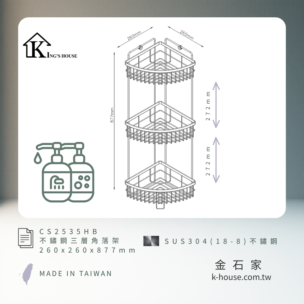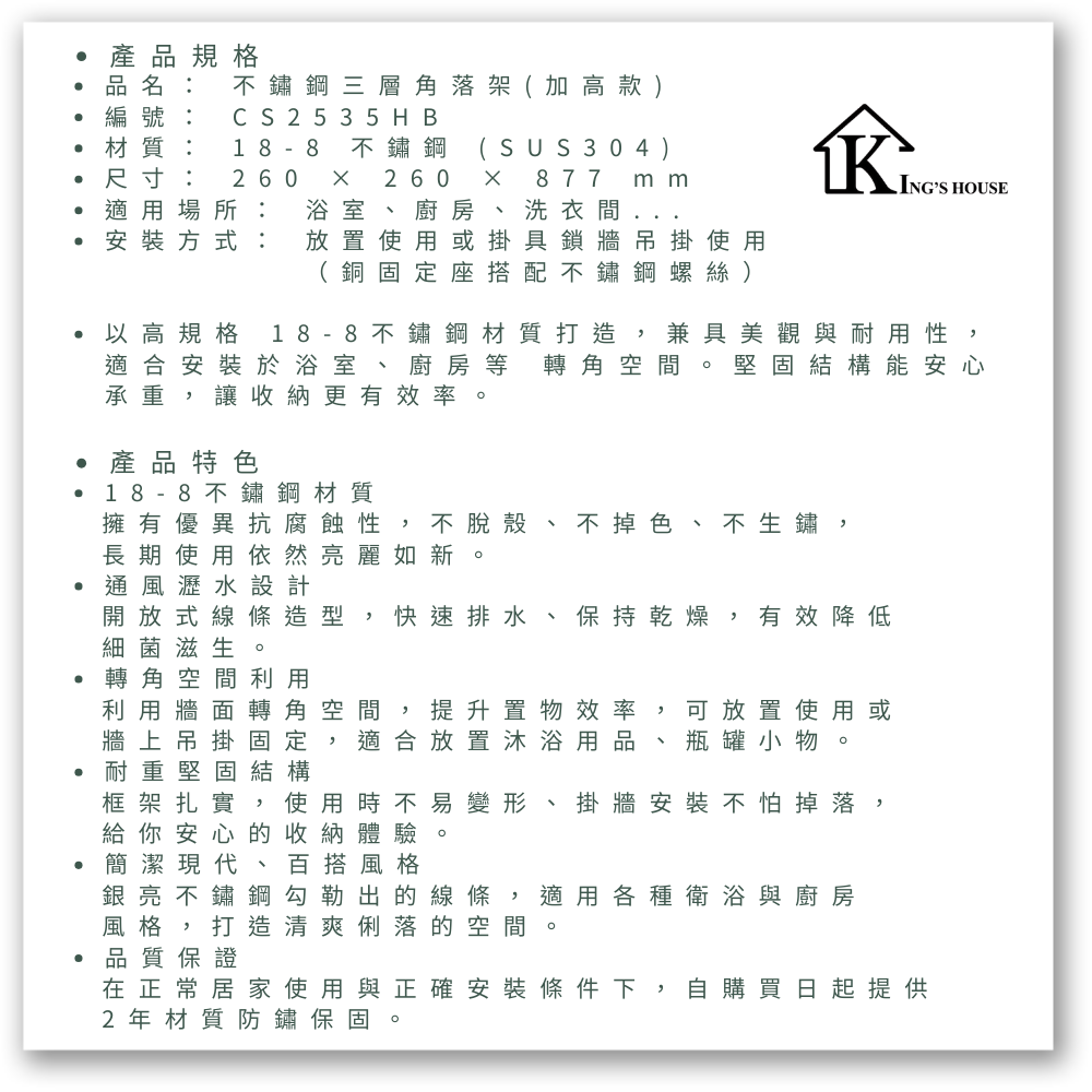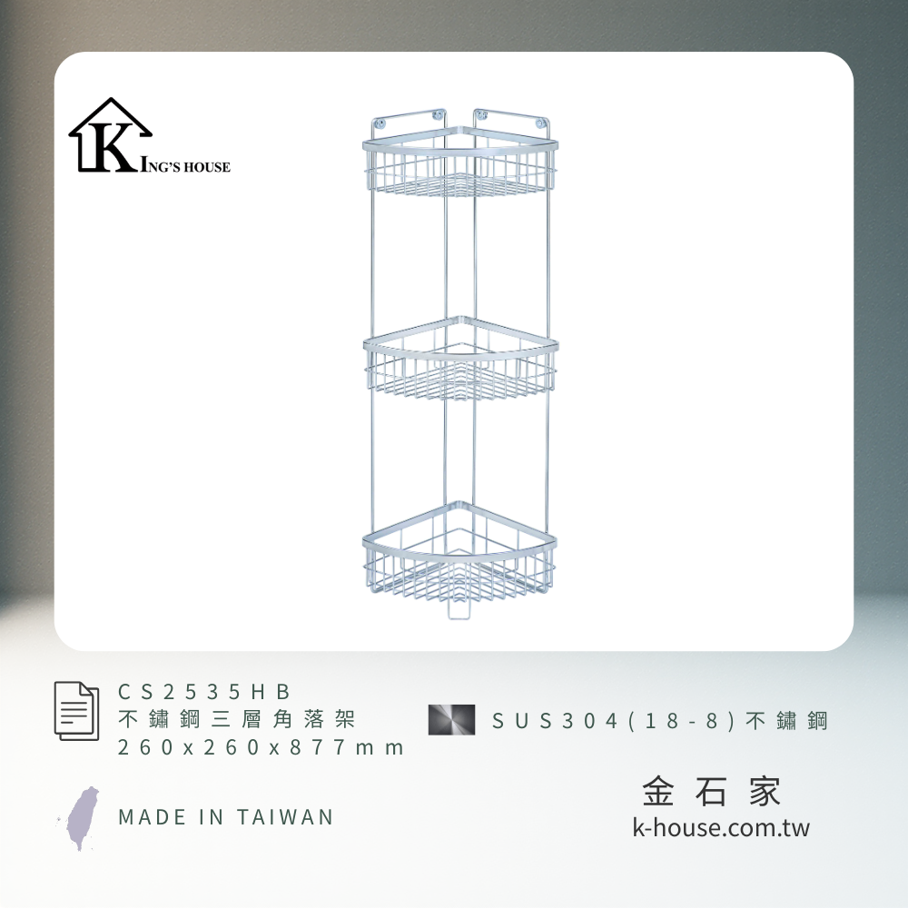 [King's house 金石家] 不鏽鋼三層角落架(加高款) / CS2535HB / SUS304不鏽鋼(18-8) / 不鏽鋼原色