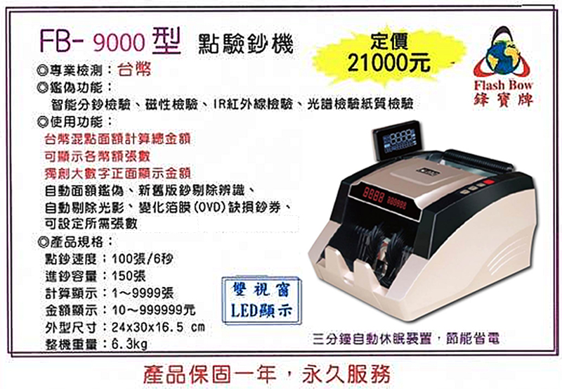 鋒寶牌 雙視窗 LED顯示 點鈔機 驗鈔機 / 台 FB-9000 (台幣)