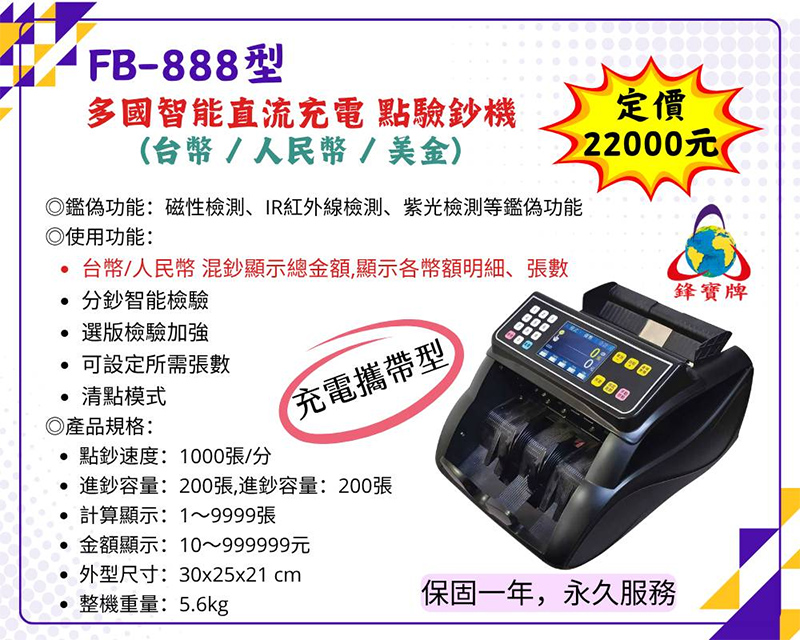 鋒寶牌 多國 智能 直流 攜帶型 免插電 充電式 點鈔機 驗鈔機 / 台 FB-888 (台幣/人民幣/美金)