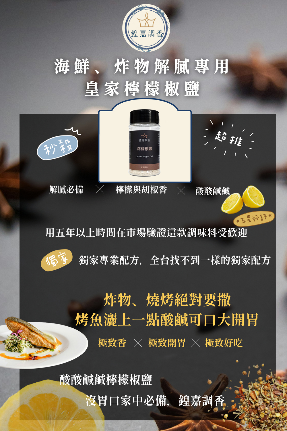 清爽檸檬香氣搭配胡椒鹹香,酸鹹平衡、開胃提鮮,最適合炸物、海鮮與雞翅。