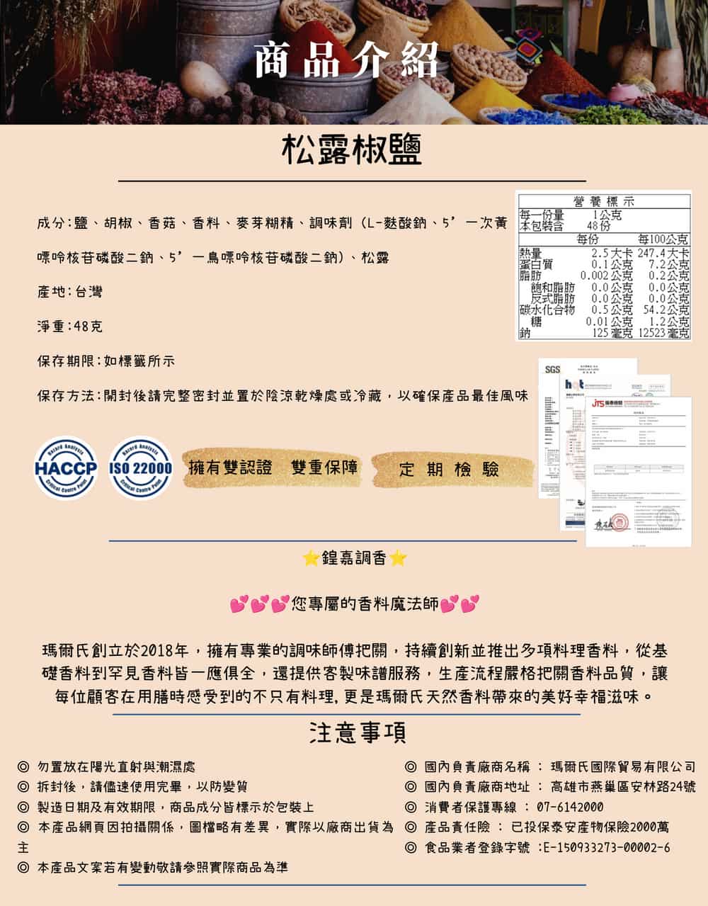 胡椒、香菇、香料、麥芽糊精、調味劑(L-麩酸鈉、5'-次黃嘌呤核苷磷酸二鈉、5'-鳥嘌呤核苷磷酸二鈉)、松露