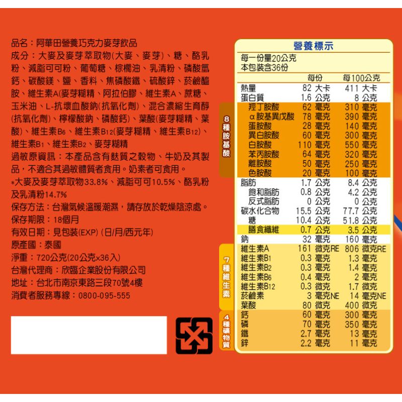 ◎品牌:阿華田 ◎規格: 20g克 x 36 x 1Box盒