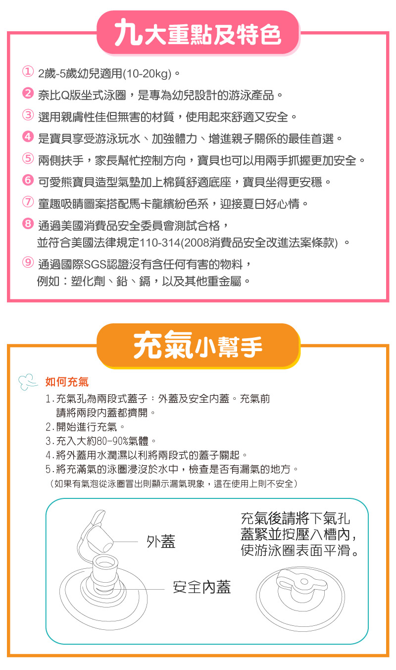 符合人體工學,安全良好的構造,幫助寶貝開始戲水的最佳泳具!親膚性材質保護寶貝嬌嫩肌膚,讓寶貝安心又輕鬆的在水裡遊玩!通過美國PVC檢測,環保、安全、無毒性,不含有害物質。