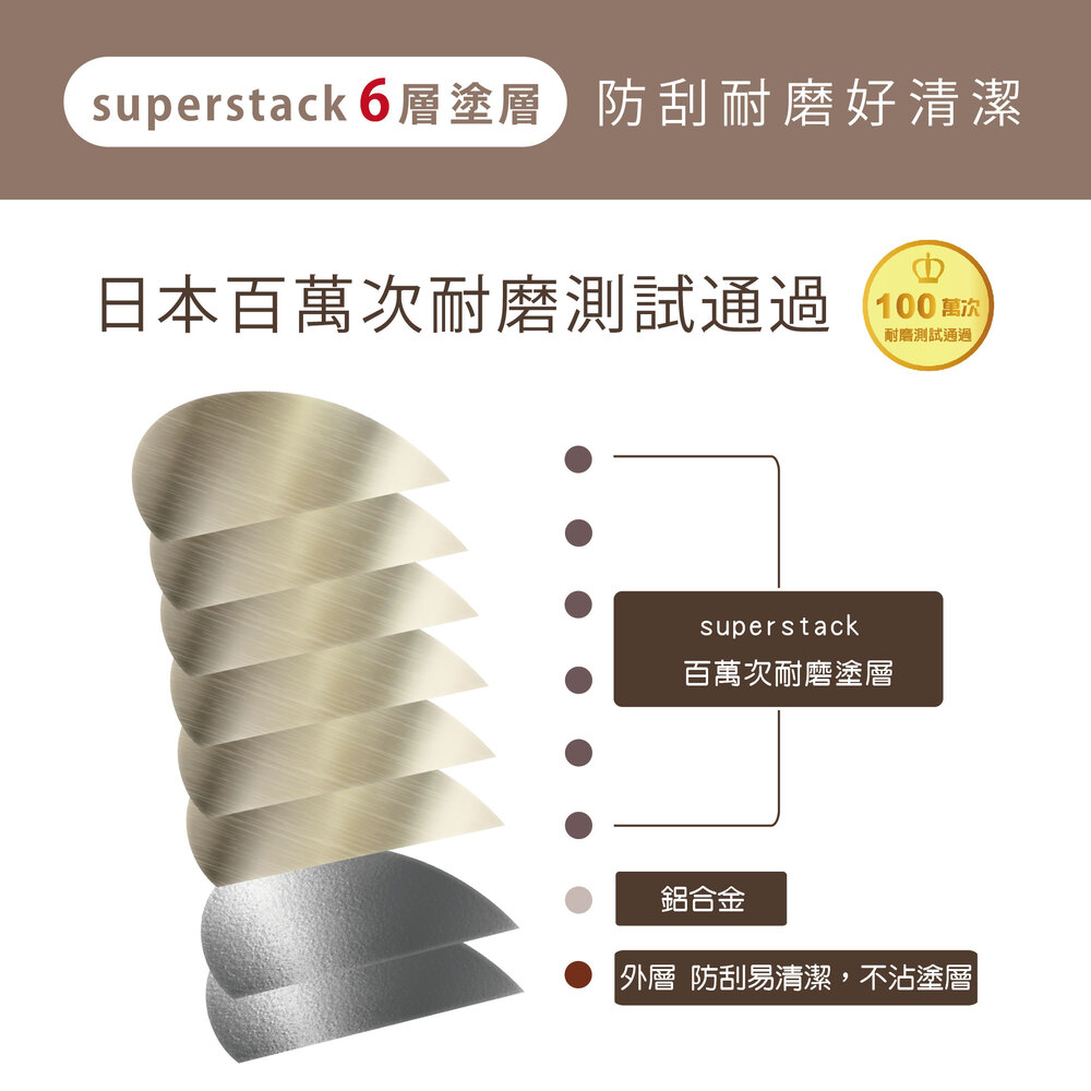 材質:鋁合金,superstack不沾塗層,把手:電木,尼龍''重要'' 不沾鍋開鍋和保養須知1.拿到鍋子時請先用清水洗鍋子表面2.鍋子裝8分滿的水煮滾5分鐘,將水倒掉後,待鍋子冷卻3.用中性洗潔精配合海綿輕輕洗鍋面4.擦乾鍋面後,塗上一層薄油,靜置一下即可使用5.下次使用時請用中性洗潔精配合海綿輕輕洗鍋面,擦乾鍋面後,塗上一層薄油,稍微熱鍋後再料理,不沾效果更佳6.建議一個月保養一次7.請務必以海綿輕輕清洗鍋具,不可使用鋼刷和菜瓜布清洗內鍋8.若有燒焦情形,等鍋具冷卻,煮滾水加熱軟化燒焦,再以海綿輕刷鍋內燒焦處