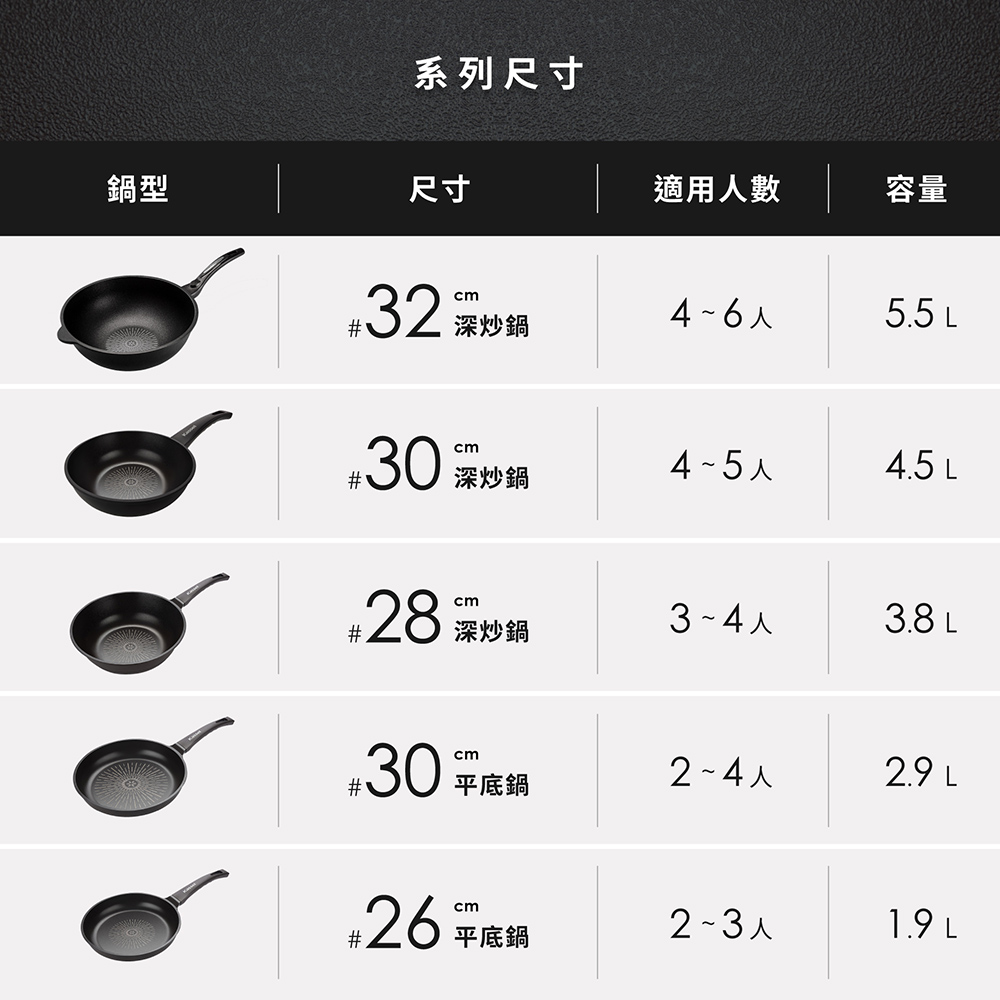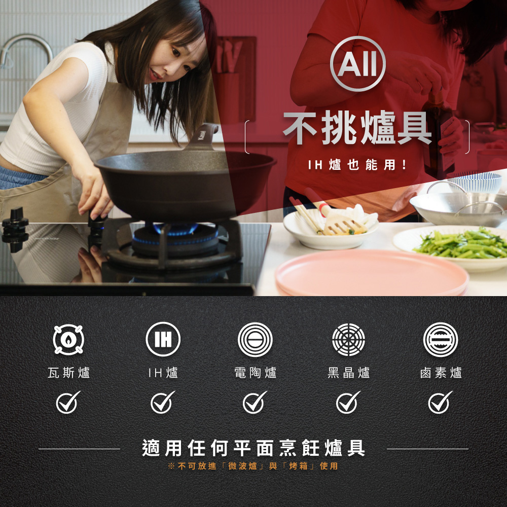 適用瓦斯爐、電爐、電陶爐、黑晶爐、鹵素爐,請勿空燒避免鍋身損壞。
