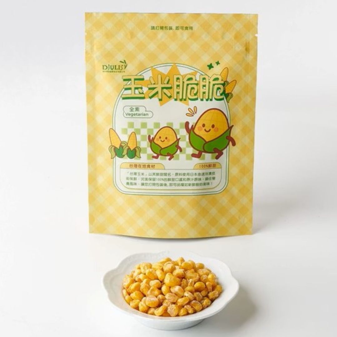 <食在美好> 為您挑選來自台東的創新農食——DJULIS德朱利斯玉米脆脆。 這是一款「還原原型」的健康零嘴,嚴選台灣最鮮甜的契作玉米,