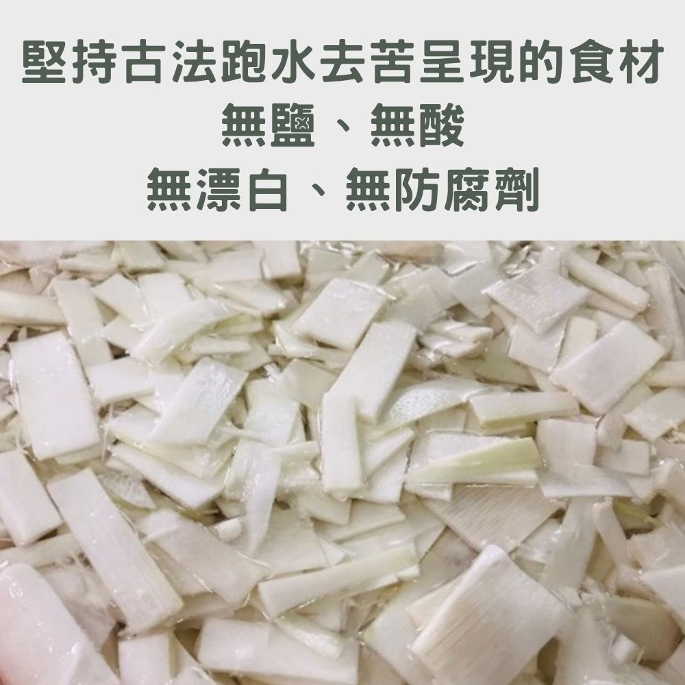 使用麻竹筍的筍管切片,利用跑水去苦3天的時間後將竹筍經過蒸空殺菌可常溫保存。除了可保留竹筍的脆度 還可以在料理上非常便利跟廣泛使用。