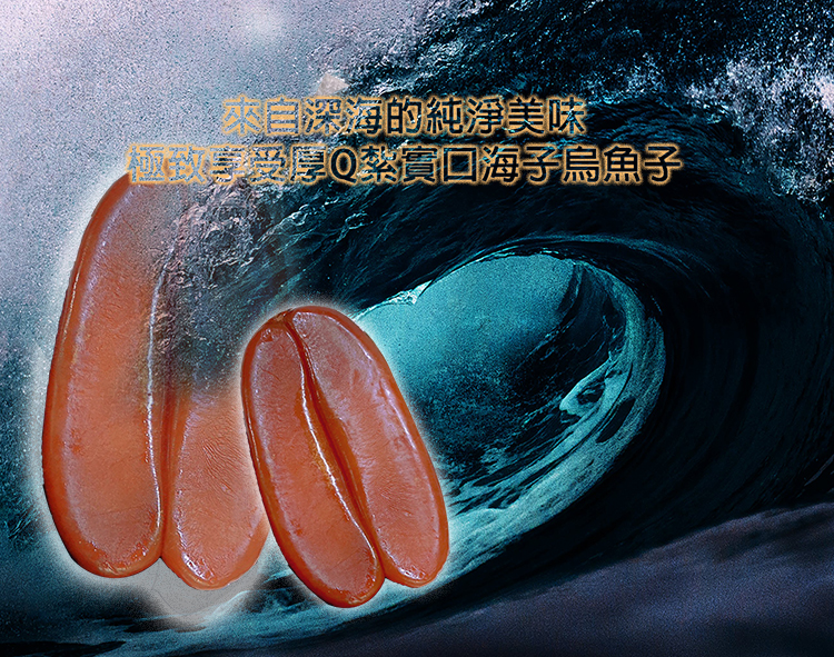品名:【鱻魚號】台灣蚵仔寮全日照海子烏魚子3片入禮盒(約1台斤)