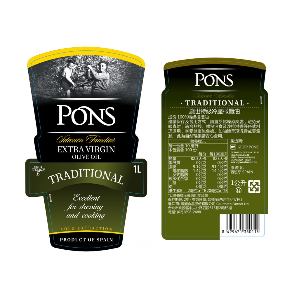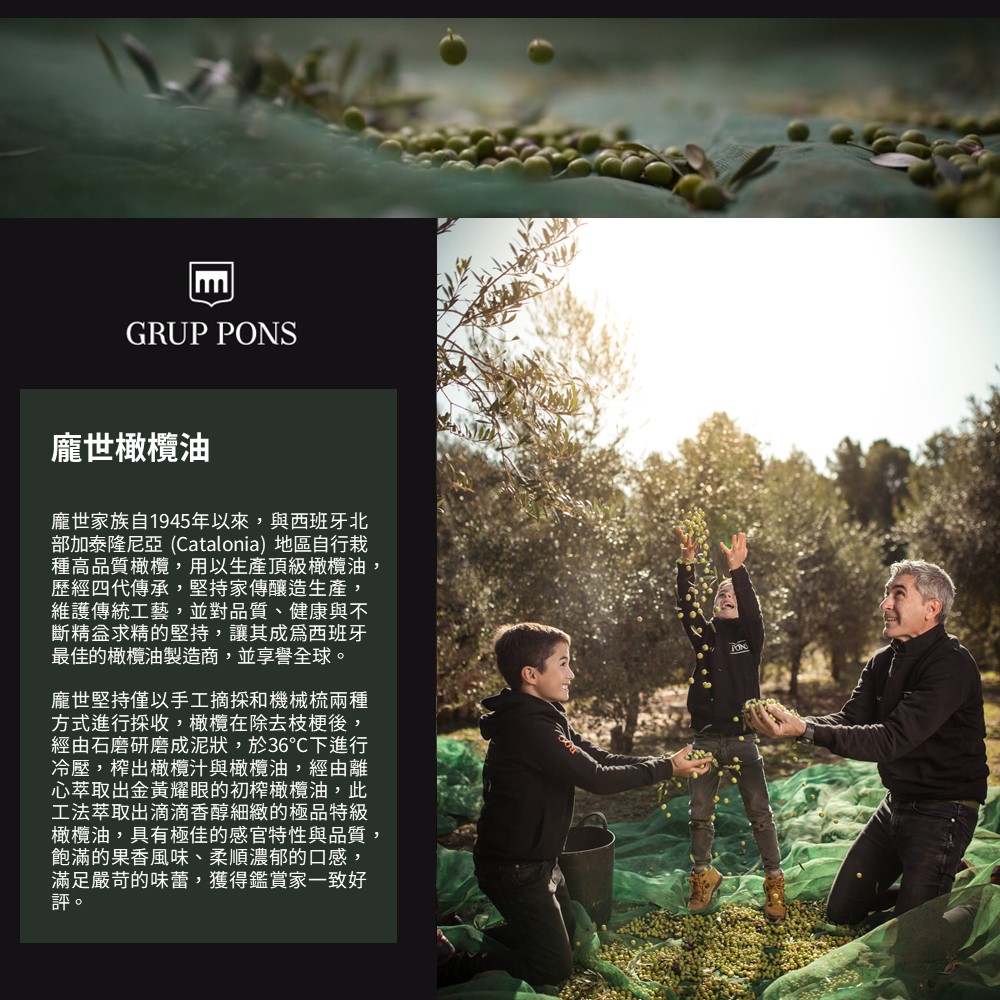 調合西班牙各地區品質最佳的橄欖,於家族磨坊中進行冷壓過程,比較起一般現代化金屬壓榨設備,石磨冷壓較不容易產生高溫,也不易會將果核過度研磨而產生苦味,保有精純的油質與香氣,適用運用在各種料理中。