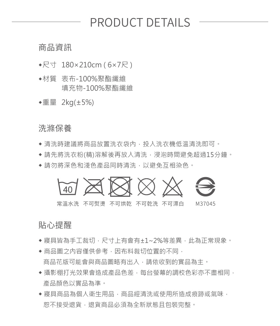 ◆清潔保養方式:可水洗/不可烘乾/不可漂白/勿使用強力漂白清潔劑/浸泡時間請勿超過20分鐘/建議可放入大型洗衣袋後再清洗(因深色布料請勿使用含漂白劑之洗劑,盡量避免浸泡,深淺色寢具請分開清洗)