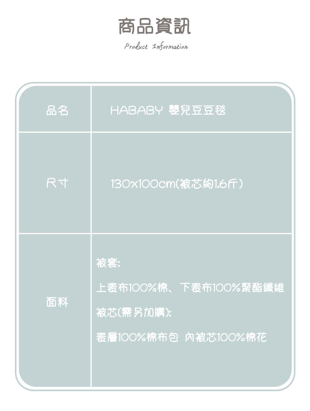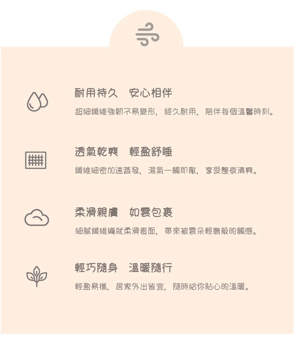 ————— 產品特色 —————(一)面料與觸感採用超細纖維面料,一面擁有立體豆粒紋理,觸感獨特;另一面締就柔滑親膚的質感,給寶寶帶來如雲朵輕撫般的柔軟體驗,猶如媽媽懷抱的延伸,能瞬間安撫寶寶情緒,給予熟悉的安全感。(二)實用性能耐用持久:超細纖維強韌不易變形,經久耐用,可長久陪伴寶寶每個溫馨時刻。透氣乾爽:纖維細密加速濕氣蒸發,讓寶寶整夜享受清爽舒睡體驗。一毯多用:可作為嬰兒車毯、哺乳巾、遊戲墊、尿布墊等,輕鬆適應多種育兒場景,陪伴寶寶成長。輕巧隨身:質地輕柔易摺疊,外出攜帶無負擔,隨時為寶寶提供熟悉舒適的移動港灣。———— 使用注意事項 ——————清洗時建議選擇溫和的嬰兒專用洗滌用品,避免使用強力去污劑,以防損傷面料或殘留化學物質刺激寶寶肌膚。洗滌後請充分晾乾,避免潮濕滋生細菌。請遠離火源,防止發生燃燒危險。若寶寶對某種面料有過敏史,建議先小面積接觸測試,無異常後再正常使用。 ★ 溫馨提示:由於電腦螢幕色差等因素,照片與實物會略有差別;另外尺寸可能因測量不同而存在誤差正負3公分屬正常,商品以實物為準