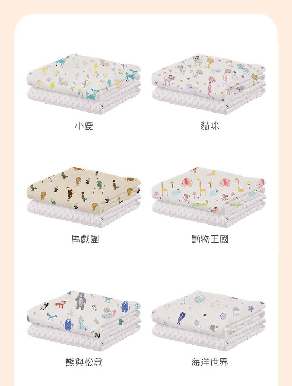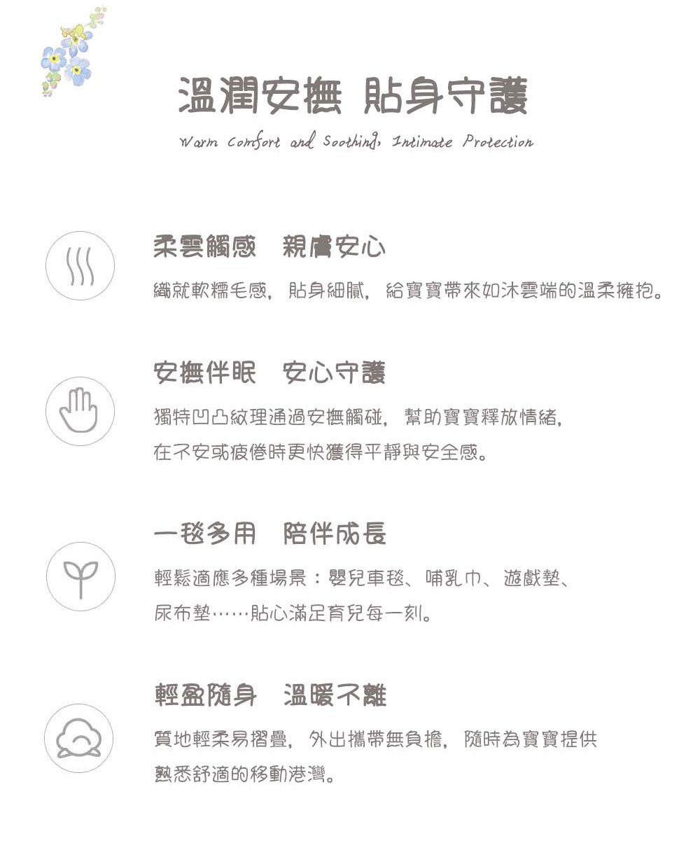 ————— 產品特色 —————(一)面料與觸感採用超細纖維面料,一面擁有立體豆粒紋理,觸感獨特;另一面締就柔滑親膚的質感,給寶寶帶來如雲朵輕撫般的柔軟體驗,猶如媽媽懷抱的延伸,能瞬間安撫寶寶情緒,給予熟悉的安全感。(二)實用性能耐用持久:超細纖維強韌不易變形,經久耐用,可長久陪伴寶寶每個溫馨時刻。透氣乾爽:纖維細密加速濕氣蒸發,讓寶寶整夜享受清爽舒睡體驗。一毯多用:可作為嬰兒車毯、哺乳巾、遊戲墊、尿布墊等,輕鬆適應多種育兒場景,陪伴寶寶成長。輕巧隨身:質地輕柔易摺疊,外出攜帶無負擔,隨時為寶寶提供熟悉舒適的移動港灣。———— 使用注意事項 ——————清洗時建議選擇溫和的嬰兒專用洗滌用品,避免使用強力去污劑,以防損傷面料或殘留化學物質刺激寶寶肌膚。洗滌後請充分晾乾,避免潮濕滋生細菌。請遠離火源,防止發生燃燒危險。若寶寶對某種面料有過敏史,建議先小面積接觸測試,無異常後再正常使用。 ★ 溫馨提示:由於電腦螢幕色差等因素,照片與實物會略有差別;另外尺寸可能因測量不同而存在誤差正負3公分屬正常,商品以實物為準