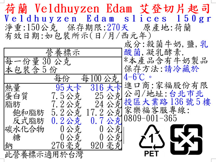 荷蘭Veldhuyzen Edam艾登切片起司