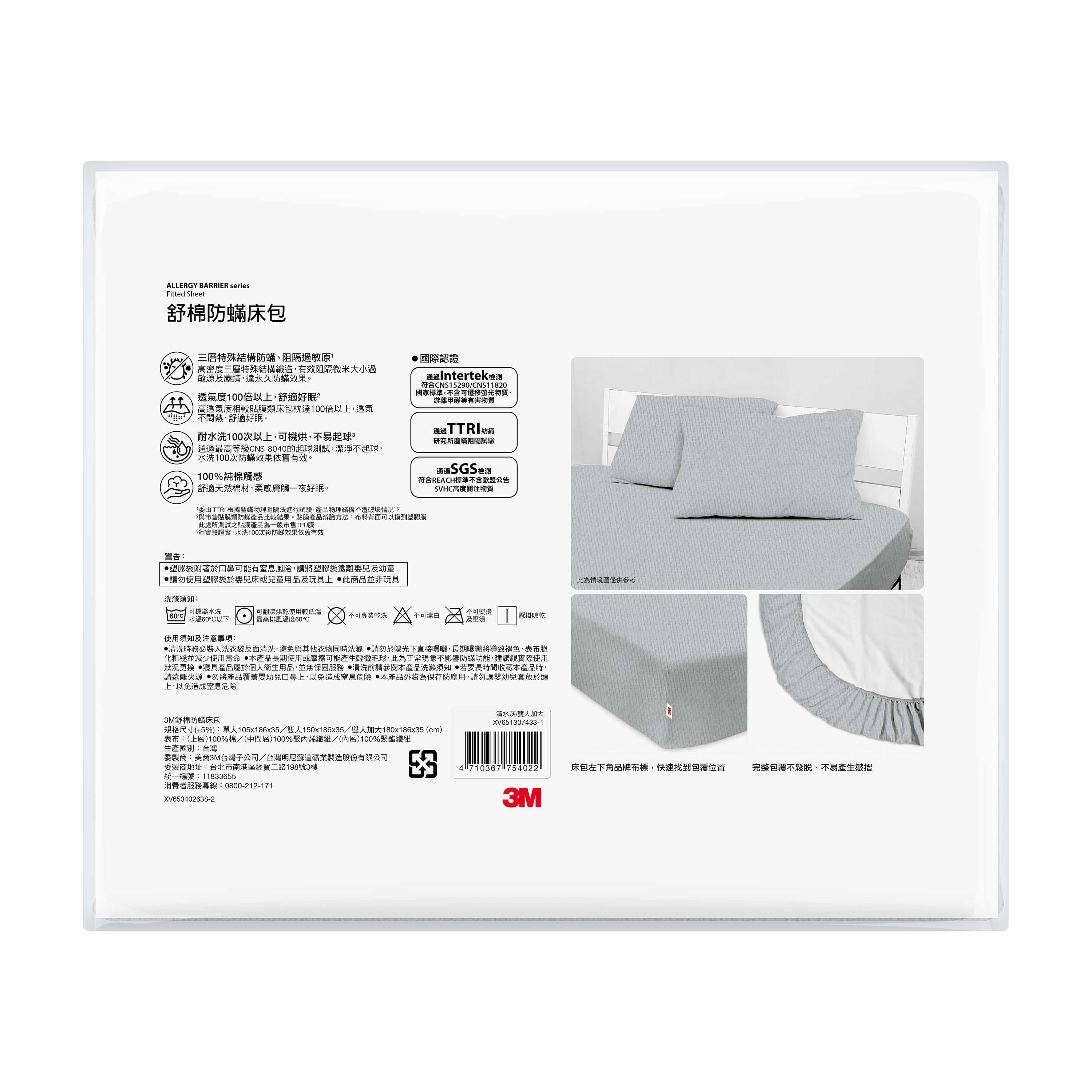 3M新一代純棉舒眠防蹣床包雙人加大-清水灰