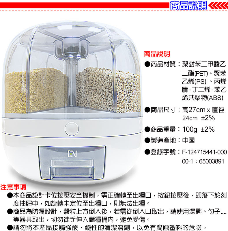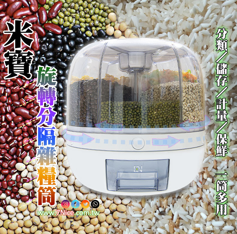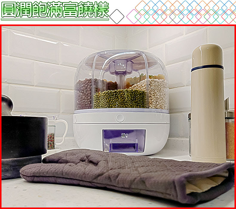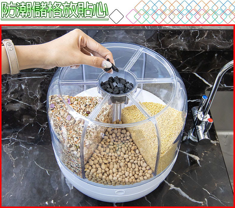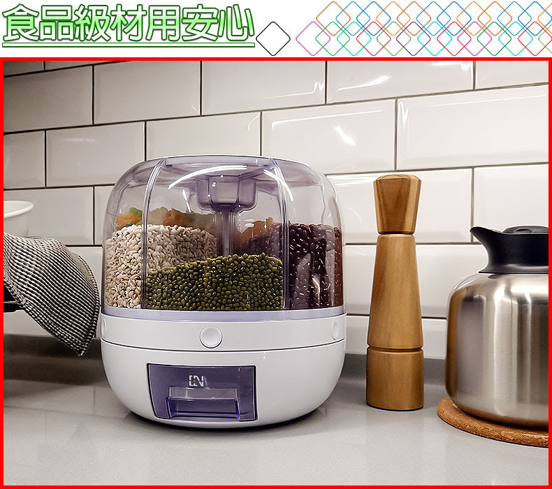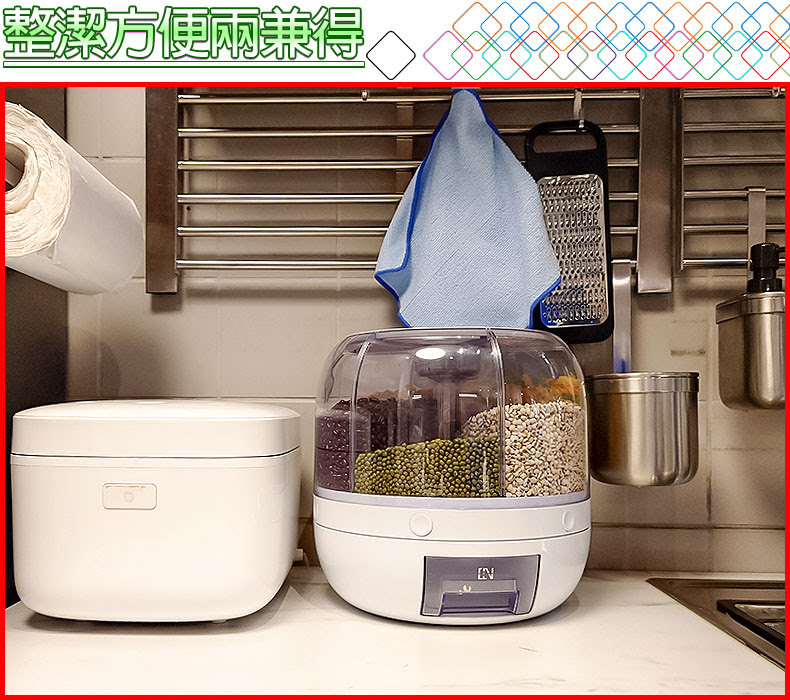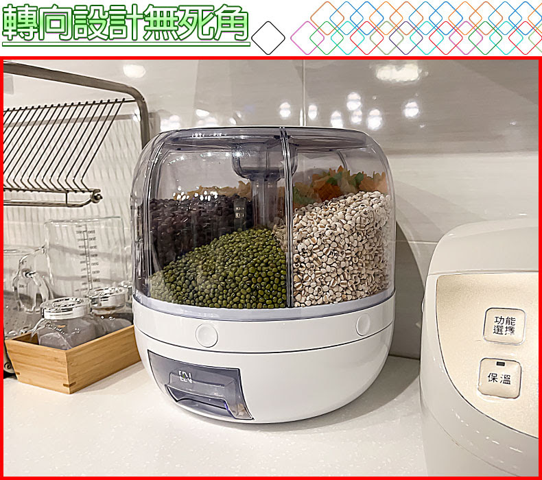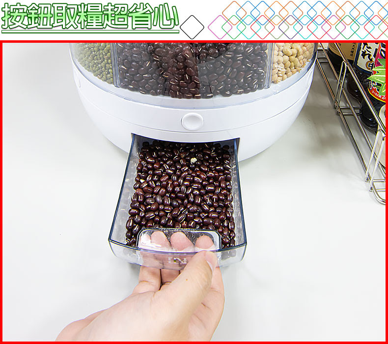 輕輕按壓即可取米,用量可隨意控制。360度旋轉,想怎麼拿就怎麼拿。獨立式抽取盒,不怕灑得滿地都是。上蓋可拆卸,透明材質內容量一眼可見。可放入防潮包,避免糧食受潮。定位按壓機制,需轉至漏斗出米口才可按壓,不再怕誤按。不僅僅是米桶,紅豆、綠豆、核桃、腰果...等,想裝甚麼就裝甚麼。