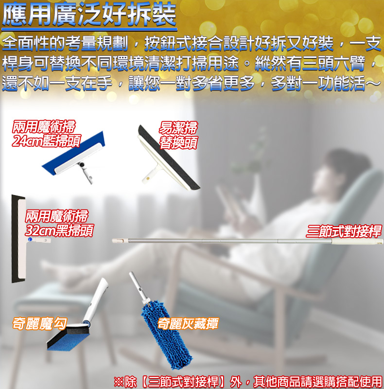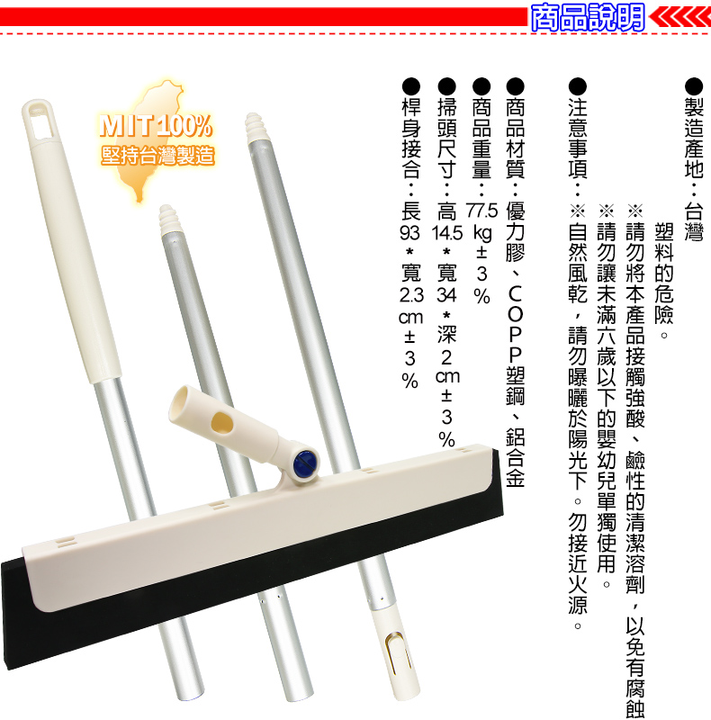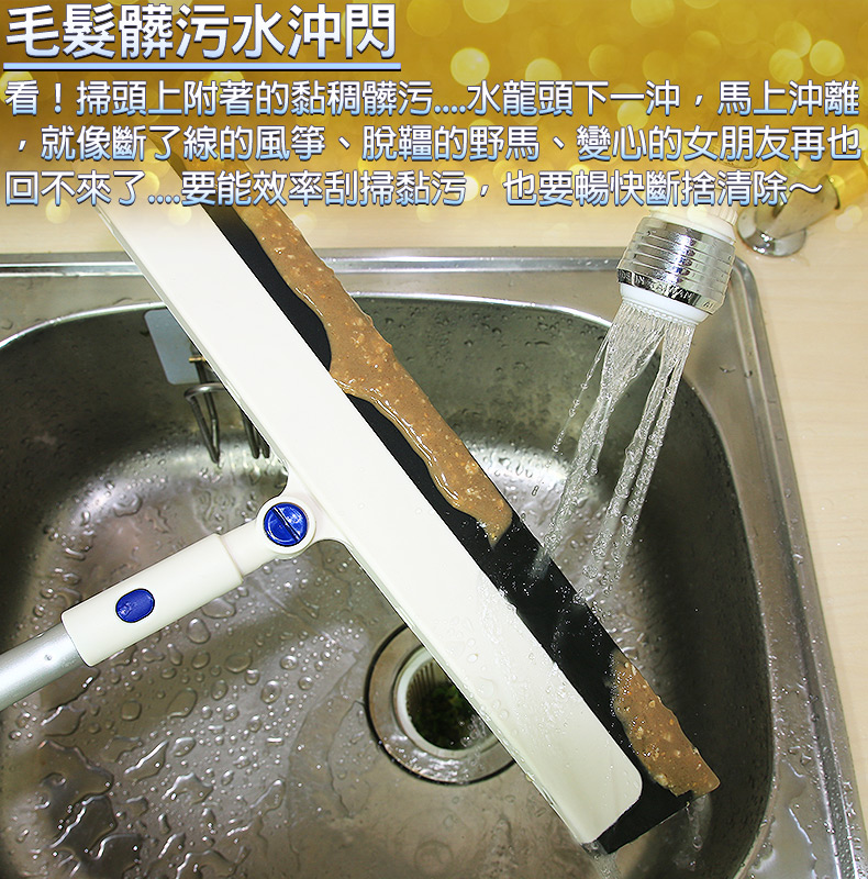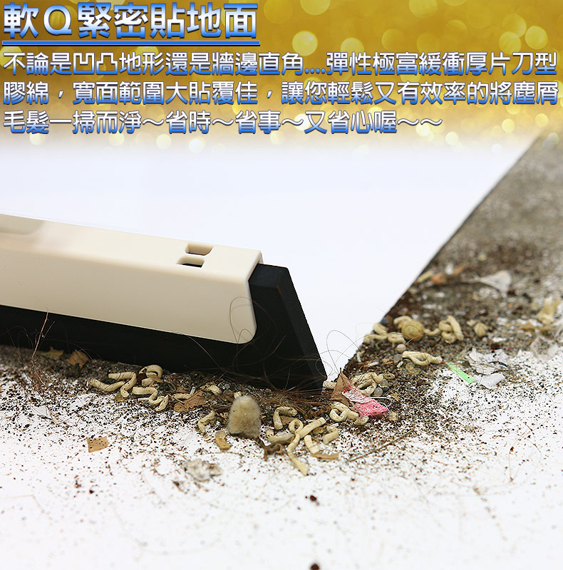 不生鏽握桿.優力膠掃頭.快速接頭,拆裝方便。三節式對接桿,收納不佔空間。不沾黏毛髮灰塵,容易清洗。優力膠具柔軟彈性,黏地力佳。耐用不變形,除塵、去污、刮水樣樣行。