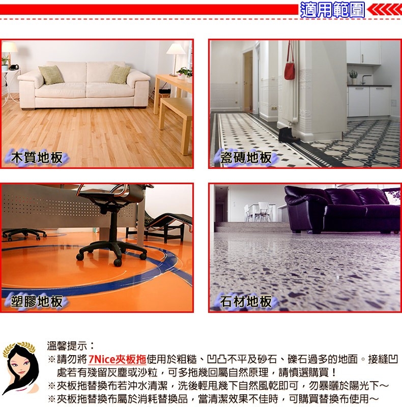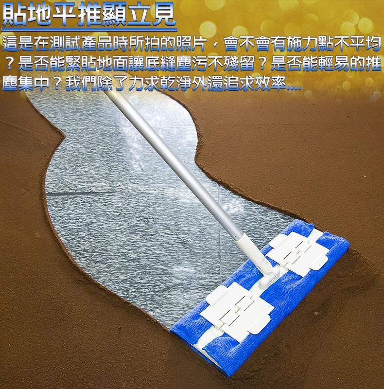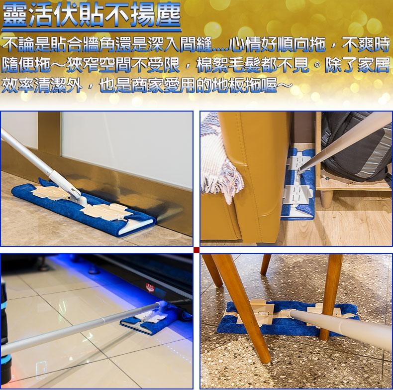 除塵紙、抹布、舊毛巾及一般符合尺寸的布料都可輕鬆夾住,不受限於特定拖把布或尺寸大小,只要符合面板大小皆可使用,既經濟又環保三節式對接桿,收納簡單沒煩惱。旋轉角度多元化,貼地力佳,清潔較無死角限制。更換布面、材料更簡單多樣化,連薄薄脆弱的紙巾、紙抹布都能輕鬆夾住使用。