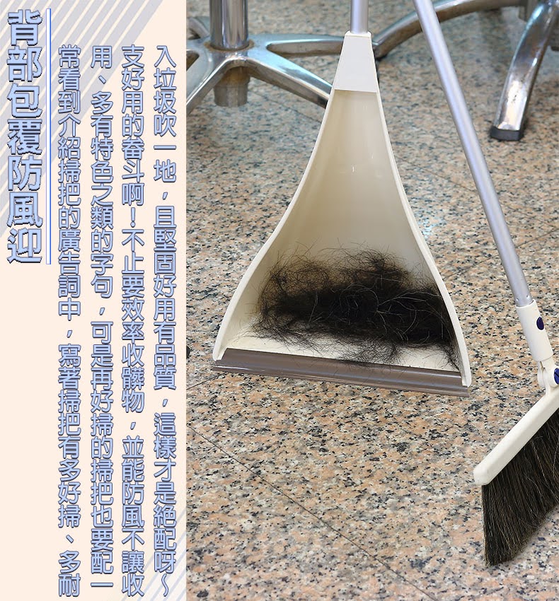 塑鋼錐形包覆,灰塵不漏出。特殊材質軟膠條,可完美貼合地面。 握桿材質鋁合金,輕巧不費力。 貼心設計掃把夾,收納沒煩惱。