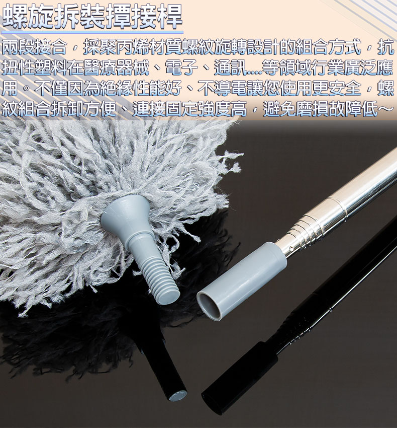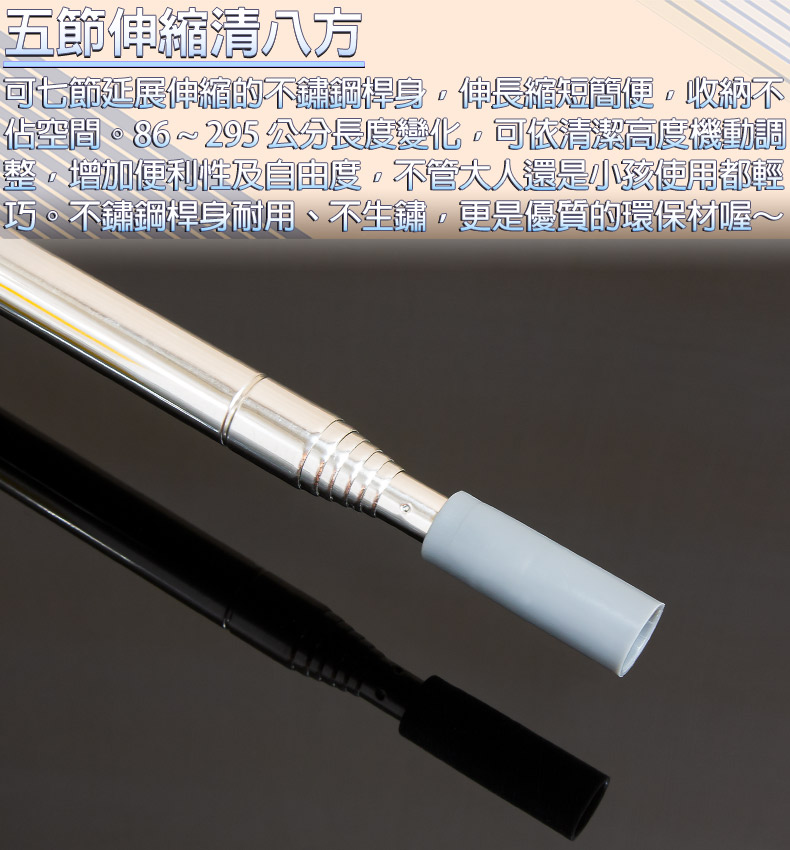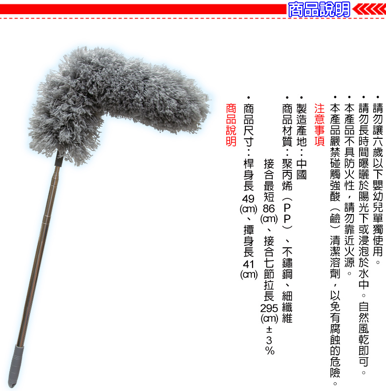 商品材質:聚丙烯(PP)、不銹鋼、細纖維商品尺寸:桿身長49(cm) 、撢身長41(cm) 接合最短86(cm) 、接合七節拉長295(cm)+5%
