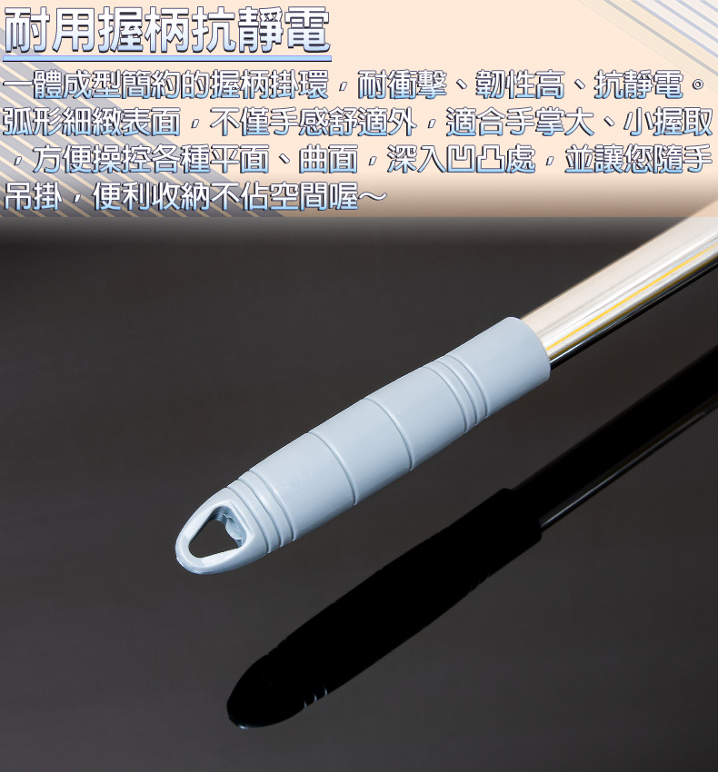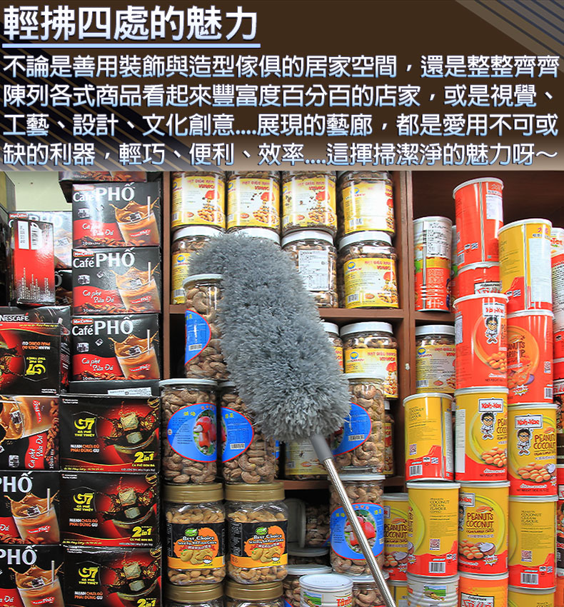 1.任意彎折式清潔,高低處縫隙皆可,輕鬆吸附灰塵。2.不銹鋼杆身,結實耐用,不易生銹,自行調節縮短86cm伸長可到295cm。3.五段式纖維織法,不易掉毛屑,除塵不傷材質。