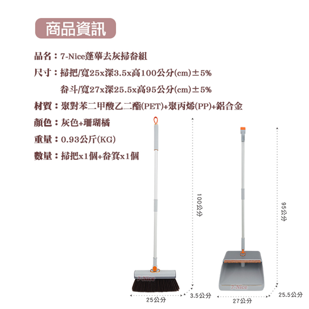 ・商品尺寸: 掃把-寬25x深3.5x高105公分 ±3% 畚斗-寬27x深25.5x高98公分 ±3%・商品材質:聚對苯二甲酸乙二酯(PET)、聚丙烯(PP)、鋁合金、不鏽鋼 ・商品重量:925克 ±2%・製造產地:中國