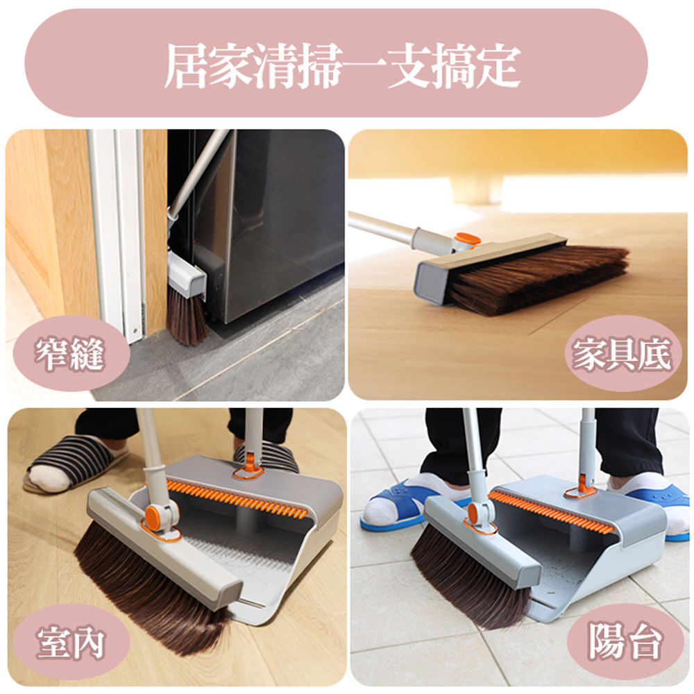 1.掃把邊刷毛斜角設計,邊角易清潔2.大容量可站立防風畚斗,防止垃圾溢出3.加長梳齒,一刮即掉,解放雙手