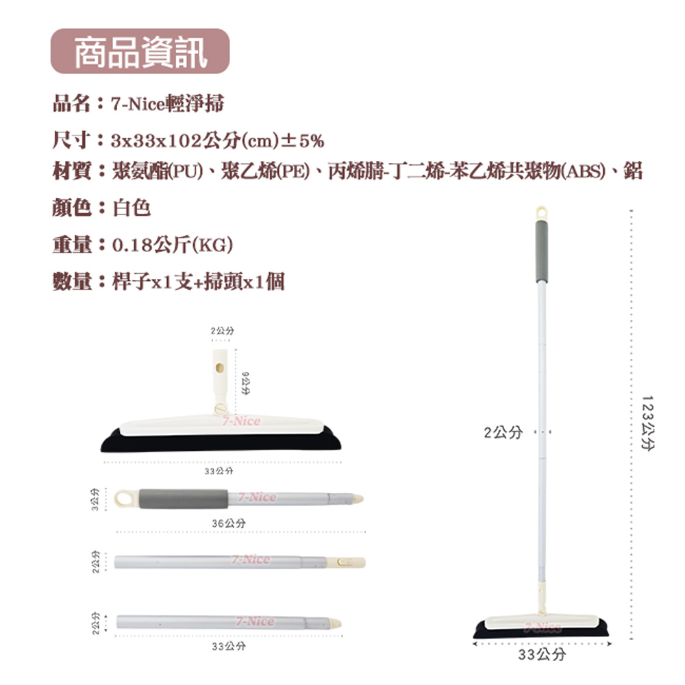 名稱:7-Nice輕淨掃數量:桿子x1支+掃頭x1個尺寸:3x33x102公分(cm)±5% 材質:聚氨酯(PU)、聚乙烯(PE)、丙烯腈-丁二烯-苯乙烯共聚物(ABS)、鋁顏色:白色重量:0.18公斤(KG)產地:中國注意事項:詳見商品包裝※商品顏色會因個人電腦螢幕調色、認知不同而有所落差,實際顏色請以收到實品為主。