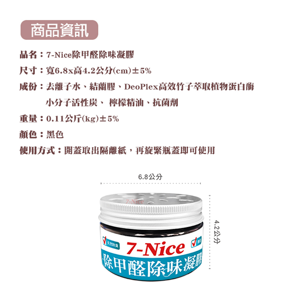 材質:去離子水、卡拉膠、DeoPlex高效竹子萃取植物蛋白酶、小分子活性炭、 檸檬精油、抗菌劑 規格:長7.5x寬7.5x高4.5公分(cm)±3%重量:0.11公斤(KG)±5%入數:除甲醛凝膠X1瓶製造日期:標示於商品外盒上保存期限:未拆封2年產地:台灣注意事項:詳見商品包裝※商品顏色會因個人電腦螢幕調色、認知不同而有所落差,實際顏色請以收到實品為主。
