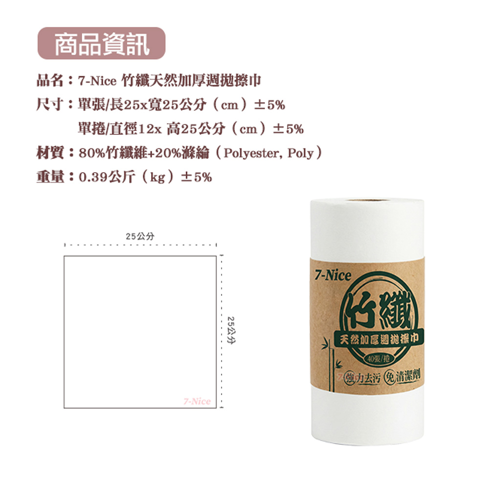 尺寸:單張/長25x寬25公分(cm)±5% 單捲/直徑12x 高25公分(cm)±5% 材質:80%竹纖維+20%滌綸(Polyester, Poly) 重量:0.39公斤(kg)±5% 產地:中國