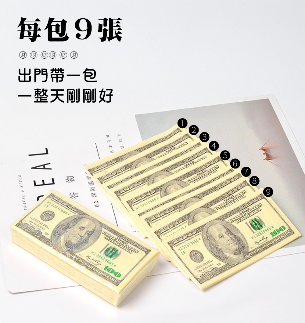搞怪美金面紙 創意面紙 每包9張 美金衛生紙 袖珍包 鈔票衛生紙 大豆油墨 3層式 柔軟 面紙 隨身包 惡搞 交換禮物