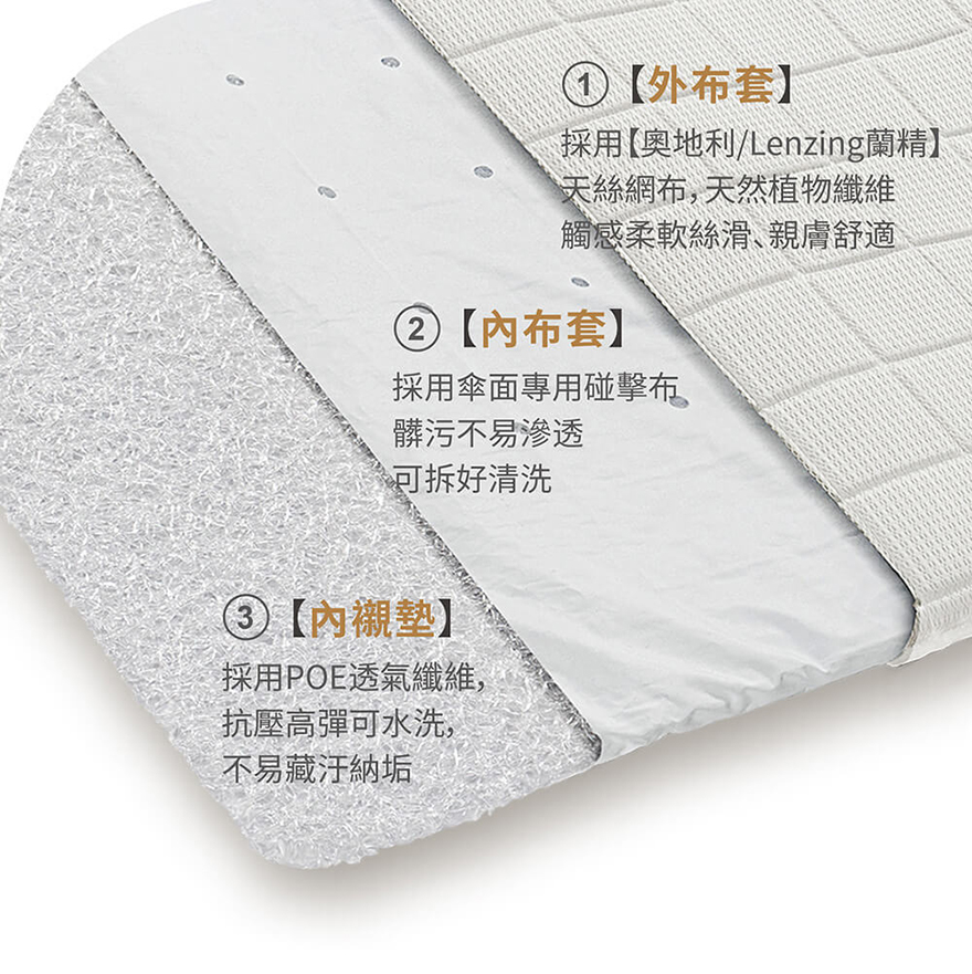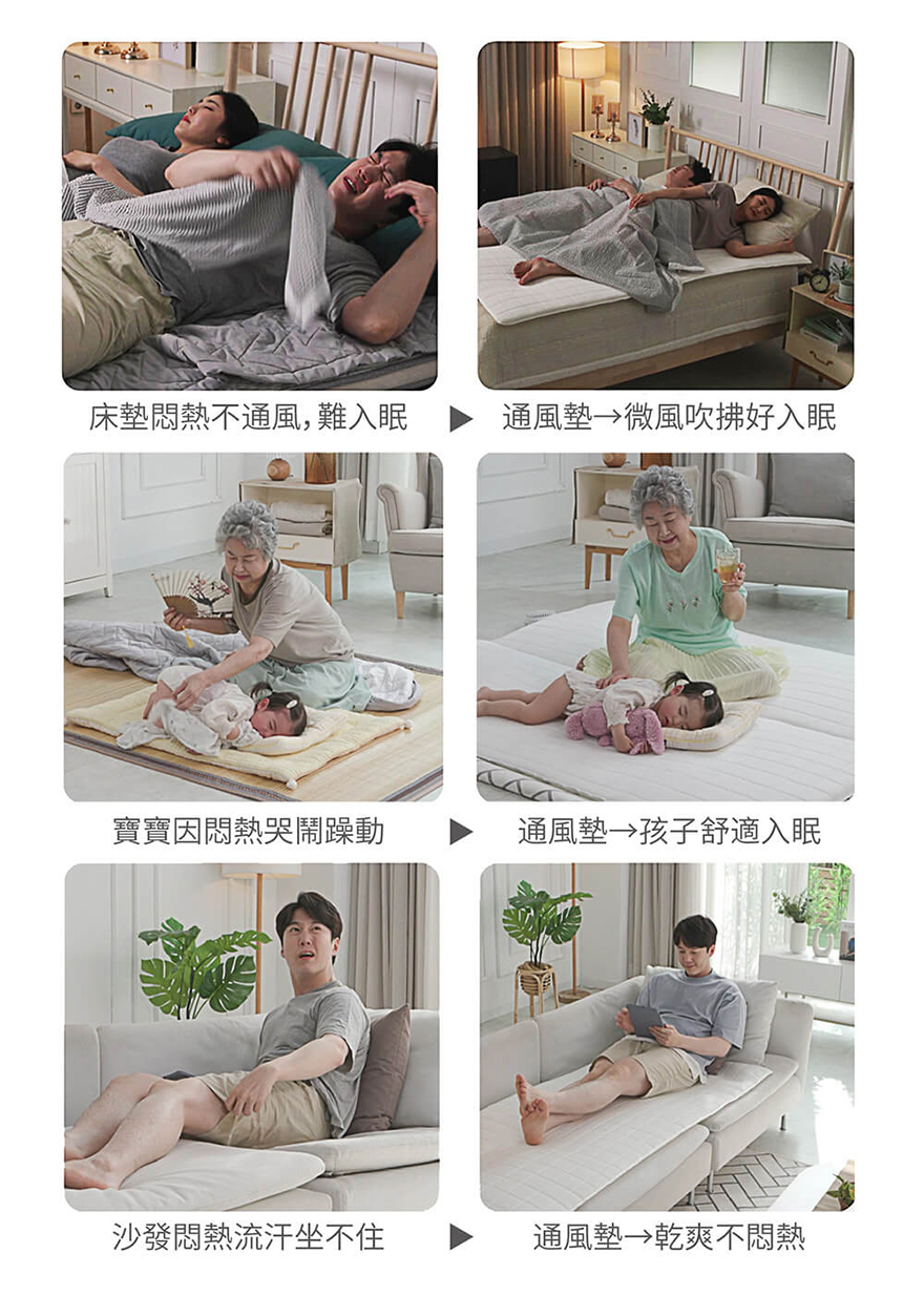 品名:Doctor Sleep 通風墊產品型號: BY010091數量:1組產品顏色:米白產品尺寸:長202公分x寬80公分x高3公分 ±2% (含風扇)床墊尺寸:長185公分x寬80公分x高3公分 ±2%產品重量:4.3kg ±5% (含配件)主要材質:USB風扇+POE纖維+天絲網布+碰擊布風扇電壓:DC 5V / 1.2A額定功率:6 W電線長度:210公分(外露長度+手控器) ±2%製造產地:中國包裝內容物:POE纖維通風墊x1 + USB風扇x1 + 手提袋+USB延長線180公分於購買日期(或製造日期)起730日內,【風扇】非人為不當使用的新品故障瑕疵維修,由本公司派車【免費來回收送】維修,所產生的費用由本公司全額負擔。(限台灣本島內收送)【風扇】在正常使用範圍內,享有自購買日期(或製造日期)起算24個月內,【風扇】零件免費維修更換的保固服務。※顏色:如產品圖示,網頁圖片因拍攝關係,若與實品略有差異,顏色以實際出貨為主。※鑑賞期內如需退換貨,商品本身、贈品、包裝彩盒均務必保持完整齊全。※機器使用中,孩童應受監護,禁止孩童嬉玩電器,避免發生危險。※風扇務必將濾心置入,以避免異物捲入導致危險