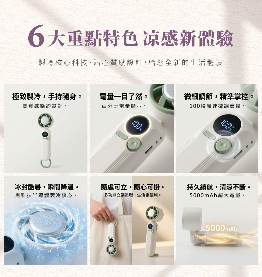 720° 全情境多角度使用+便利掛勾靈活折疊設計,解鎖各種清涼姿態!支援 手持、90°仰角桌用、平放、掛脖使用。全新加入「扣環式掛勾」,可隨新掛於包包或手機鍊無論通勤、辦公、野餐或追劇,涼爽隨手可得。