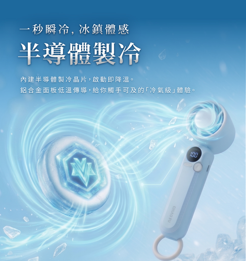 半導體製冷晶片鋁合金面板「一秒即冷」,啟動即降溫。不只吹風更能直接冰敷頸部與手腕,瞬降體感溫差,終結夏日無效熱風。