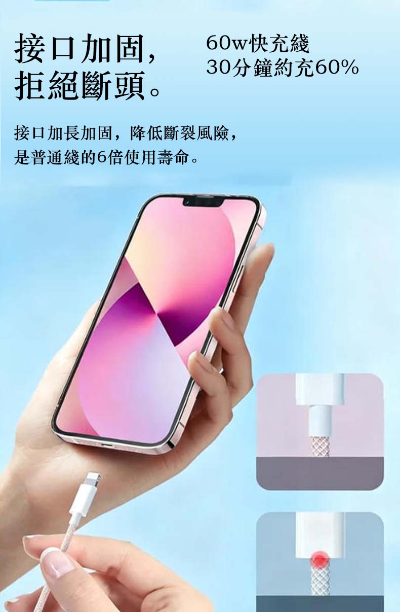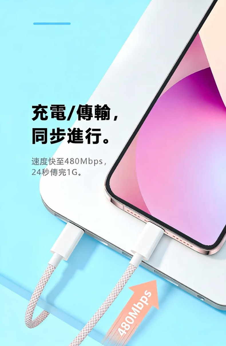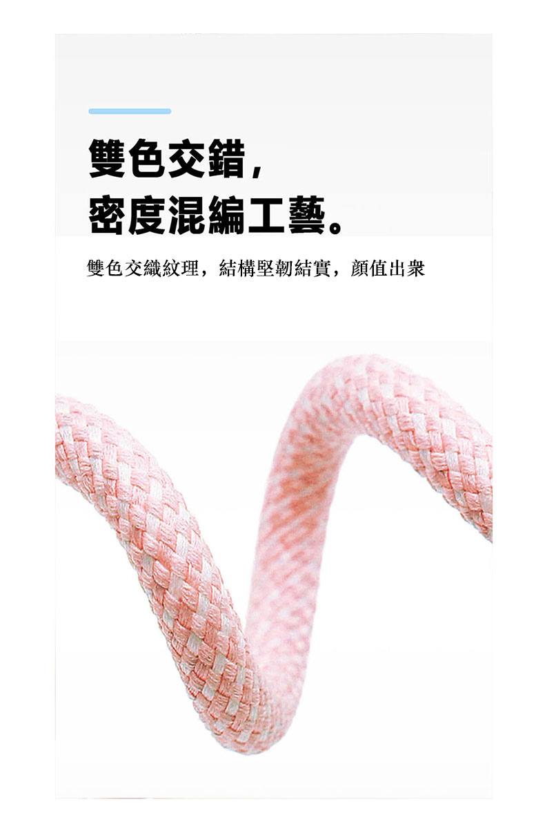同級首選耐用標杆|快充 + 耐用雙頂配不只快充、更耐用,我們的充電線直接成為同級耐用與效率的雙標杆:⚡ 60W PD/QC 雙協議疾速快充🧵 高密編織耐用材質📏 2m 自由長距體驗🎨 多色可選(多色顏值款)⚡ 疾速快充 + 同步傳輸|效率直接拉滿支援 PD/QC 雙快充協議,30 分鐘約充設備 60% 電量;同時支援充電 + 數據傳輸,速度達 480Mbps,充電、傳文件同步進行,不用再分先後。全機型適配:支援iPhone/華爲/小米等Type-C接口(PD 快充)接口設備,不挑機、插即充。✨高密編織耐用王|壽命是普通線的 6 倍採用高密編織工藝,耐磨防刮、抗弯折性遠超普通塑膠線;反覆彎折不易斷裂、日常磨損不易破損,長期使用依舊穩定耐用,告別「用幾次就壞」的煩惱。📏多色高顏值|體驗與美觀兼備,多色高顏值:多種清新顏色搭配編織紋理,簡約耐看還不易髒,不管搭配手機還是充電寶,都是日常使用的顏值加分項。🔒 安全認證 + 自收納|穩定不踩雷全兼容原廠認證標準,充電穩定不發燙,有效保護設備電池壽命;支援自卷 / 自收納設計,不用時輕鬆整理,告別線體纏繞雜亂。🌟 為什麼幾乎所有使用者都選我們?✅ 60W 快充同級效率最高:疾速充電 + 同步傳輸雙在線✅ 耐用性首選:高密編織壽命是普通線的 6 倍✅ 使用最靈活:2m 距離使用靈活✅ 全機型適配:不挑蘋果 / 安卓設備✅ 長期使用最穩定:不斷線、不發燙、體驗不打折