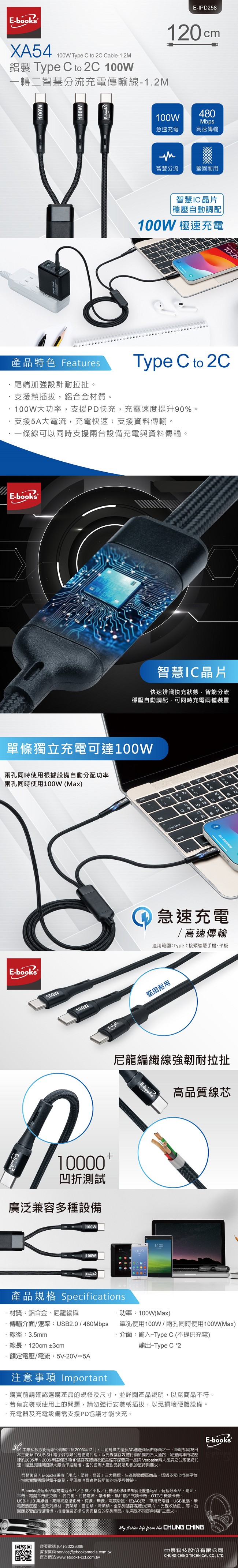 [ E-books ] XA54 鋁製Type C to 2C 100W 一轉二智慧分流充電傳輸線-1.2M